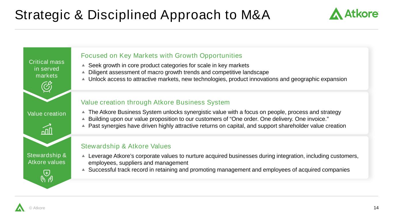 13© Atkore FY 2023 Capital Expenditures FY 2024 & Future Planning Investing In Our Future Plan to further grow new Indiana facility with capabilities to support global mega projects Continue to invest and grow service capabilities with strategically located warehousing operations Expect continued investment in Texas in FY 2024 for both HDPE and non-conduit PVC related products Expect elevated digital investments in FY 2024 & FY 2025 vs. FY 2023 Expect “Routine” capital expenditures to be similar to depreciation over time Conduits of Growth Digital Routine ~30% ~5% ~65% $219M