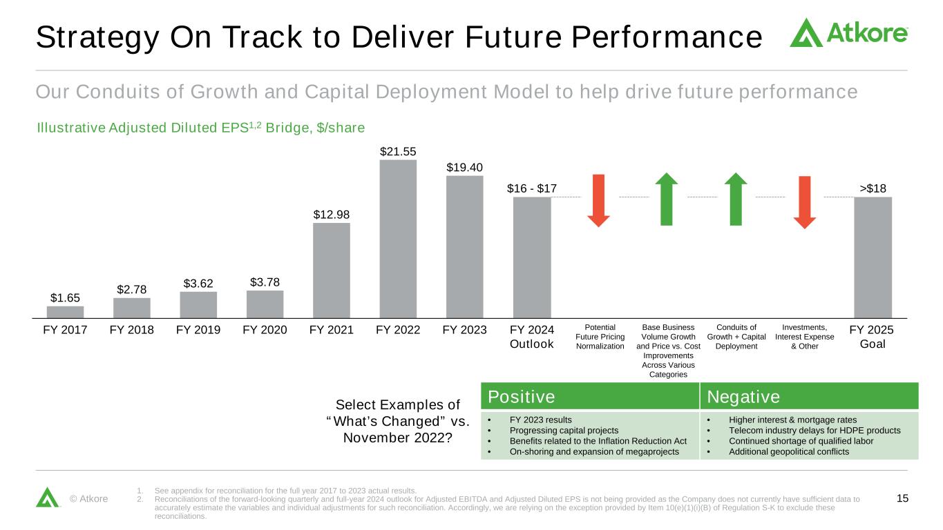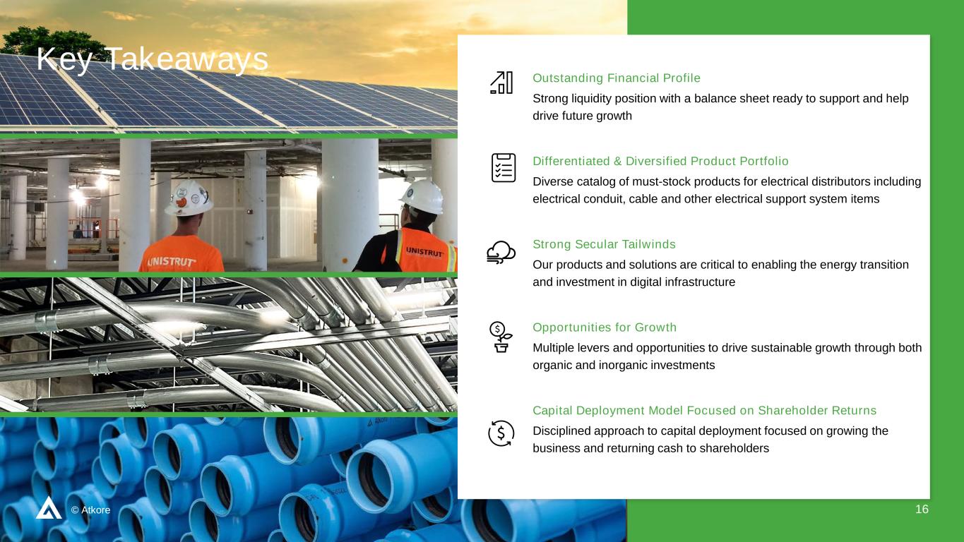15© Atkore Our Conduits of Growth and Capital Deployment Model to help drive future performance Strategy On Track to Deliver Future Performance Illustrative Adjusted Diluted EPS1,2 Bridge, $/share 1. See appendix for reconciliation for the full year 2017 to 2023 actual results. 2. Reconciliations of the forward-looking quarterly and full-year 2024 outlook for Adjusted EBITDA and Adjusted Diluted EPS is not being provided as the Company does not currently have sufficient data to accurately estimate the variables and individual adjustments for such reconciliation. Accordingly, we are relying on the exception provided by Item 10(e)(1)(i)(B) of Regulation S-K to exclude these reconciliations. FY 2024 Outlook Potential Future Pricing Normalization Base Business Volume Growth and Price vs. Cost Improvements Across Various Categories Conduits of Growth + Capital Deployment Investments, Interest Expense & Other FY 2025 Goal $16 - $17 >$18 $1.65 $2.78 $3.62 $3.78 $12.98 $21.55 $19.40 FY 2017 FY 2018 FY 2019 FY 2020 FY 2021 FY 2022 FY 2023 Positive Negative • FY 2023 results • Progressing capital projects • Benefits related to the Inflation Reduction Act • On-shoring and expansion of megaprojects • Higher interest & mortgage rates • Telecom industry delays for HDPE products • Continued shortage of qualified labor • Additional geopolitical conflicts Select Examples of “What’s Changed” vs. November 2022?