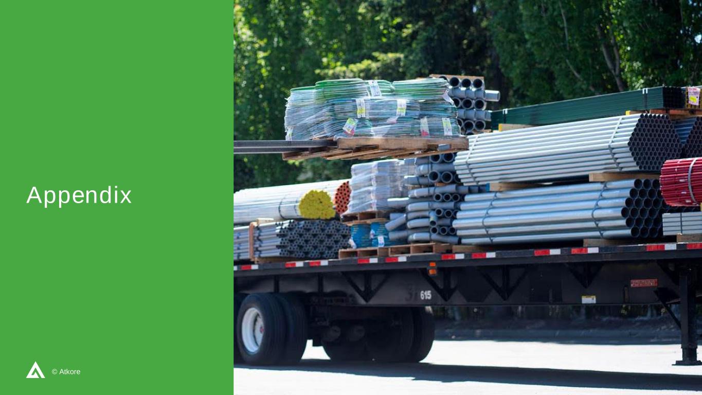22© Atkore Abbreviations listed in alphanumeric order Glossary of Terms Abbreviation Description 1H First Half 2H Second Half ABS Atkore Business System Adj. Adjusted AI Artificial Intelligence B Billion Capex Capital Expenditures DD% Double Digit Percentage EBITDA Earnings Before Interest, Taxes, Depreciation, & Amortization EPS Earnings Per Share Est. Estimated Excl. Excluding FX or F/X Foreign Exchange FY Fiscal Year GGAM Government Grant Accounting Model HDPE High Density Polyethylene HSD% High Single Digit Percentage IPO Initial Public Offering Abbreviation Description LDD% Low Double Digit Percentage LSD% Low Single Digit Percentage M Million M&A Mergers & Acquisitions MSD% Mid Single Digit Percentage PVC Polyvinyl Chloride Q1 First Quarter Q2 Second Quarter Q3 Third Quarter Q4 Fourth Quarter RSC Regional Service Center S&I Safety & Infrastructure TTM Trailing Twelve Months U.S. United States of America USD United States Dollar #X Number of Times YE Year End YTD Year to Date