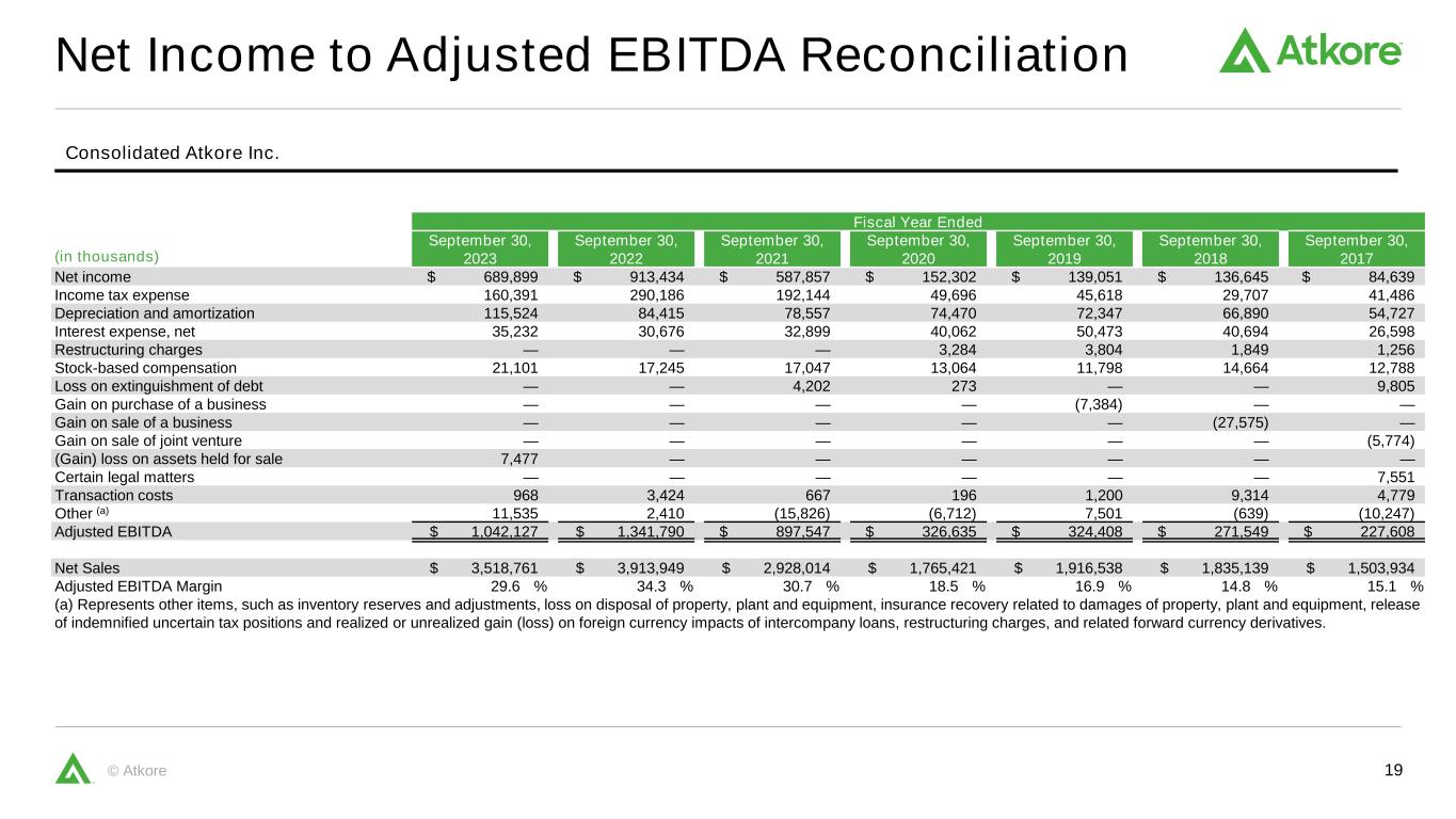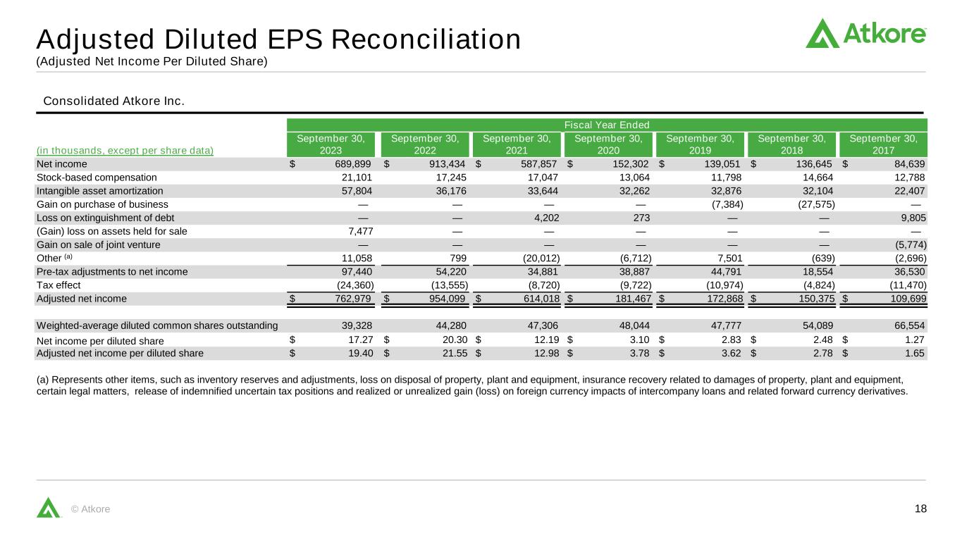 18© Atkore Consolidated Atkore Inc. Adjusted Diluted EPS Reconciliation (Adjusted Net Income Per Diluted Share) (in thousands, except per share data) Fiscal Year Ended September 30, 2023 September 30, 2022 September 30, 2021 September 30, 2020 September 30, 2019 September 30, 2018 September 30, 2017 Net income $ 689,899 $ 913,434 $ 587,857 $ 152,302 $ 139,051 $ 136,645 $ 84,639 Stock-based compensation 21,101 17,245 17,047 13,064 11,798 14,664 12,788 Intangible asset amortization 57,804 36,176 33,644 32,262 32,876 32,104 22,407 Gain on purchase of business — — — — (7,384) (27,575) — Loss on extinguishment of debt — — 4,202 273 — — 9,805 (Gain) loss on assets held for sale 7,477 — — — — — — Gain on sale of joint venture — — — — — — (5,774) Other (a) 11,058 799 (20,012) (6,712) 7,501 (639) (2,696) Pre-tax adjustments to net income 97,440 54,220 34,881 38,887 44,791 18,554 36,530 Tax effect (24,360) (13,555) (8,720) (9,722) (10,974) (4,824) (11,470) Adjusted net income $ 762,979 $ 954,099 $ 614,018 $ 181,467 $ 172,868 $ 150,375 $ 109,699 Weighted-average diluted common shares outstanding 39,328 44,280 47,306 48,044 47,777 54,089 66,554 Net income per diluted share $ 17.27 $ 20.30 $ 12.19 $ 3.10 $ 2.83 $ 2.48 $ 1.27 Adjusted net income per diluted share $ 19.40 $ 21.55 $ 12.98 $ 3.78 $ 3.62 $ 2.78 $ 1.65 (a) Represents other items, such as inventory reserves and adjustments, loss on disposal of property, plant and equipment, insurance recovery related to damages of property, plant and equipment, certain legal matters, release of indemnified uncertain tax positions and realized or unrealized gain (loss) on foreign currency impacts of intercompany loans and related forward currency derivatives.