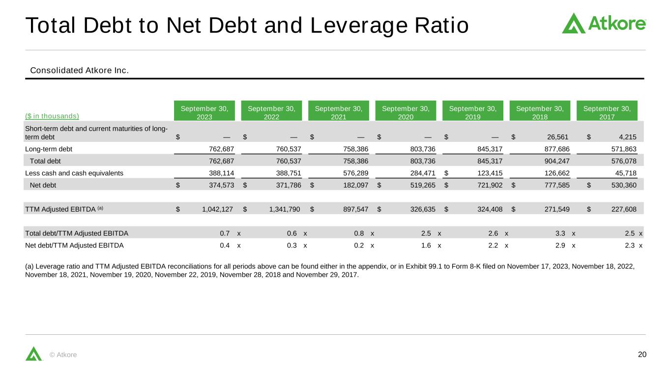 19© Atkore Net Income to Adjusted EBITDA Reconciliation Fiscal Year Ended (in thousands) September 30, 2023 September 30, 2022 September 30, 2021 September 30, 2020 September 30, 2019 September 30, 2018 September 30, 2017 Net income $ 689,899 $ 913,434 $ 587,857 $ 152,302 $ 139,051 $ 136,645 $ 84,639 Income tax expense 160,391 290,186 192,144 49,696 45,618 29,707 41,486 Depreciation and amortization 115,524 84,415 78,557 74,470 72,347 66,890 54,727 Interest expense, net 35,232 30,676 32,899 40,062 50,473 40,694 26,598 Restructuring charges — — — 3,284 3,804 1,849 1,256 Stock-based compensation 21,101 17,245 17,047 13,064 11,798 14,664 12,788 Loss on extinguishment of debt — — 4,202 273 — — 9,805 Gain on purchase of a business — — — — (7,384) — — Gain on sale of a business — — — — — (27,575) — Gain on sale of joint venture — — — — — — (5,774) (Gain) loss on assets held for sale 7,477 — — — — — — Certain legal matters — — — — — — 7,551 Transaction costs 968 3,424 667 196 1,200 9,314 4,779 Other (a) 11,535 2,410 (15,826) (6,712) 7,501 (639) (10,247) Adjusted EBITDA $ 1,042,127 $ 1,341,790 $ 897,547 $ 326,635 $ 324,408 $ 271,549 $ 227,608 Net Sales $ 3,518,761 $ 3,913,949 $ 2,928,014 $ 1,765,421 $ 1,916,538 $ 1,835,139 $ 1,503,934 Adjusted EBITDA Margin 29.6 % 34.3 % 30.7 % 18.5 % 16.9 % 14.8 % 15.1 % (a) Represents other items, such as inventory reserves and adjustments, loss on disposal of property, plant and equipment, insurance recovery related to damages of property, plant and equipment, release of indemnified uncertain tax positions and realized or unrealized gain (loss) on foreign currency impacts of intercompany loans, restructuring charges, and related forward currency derivatives. Consolidated Atkore Inc.