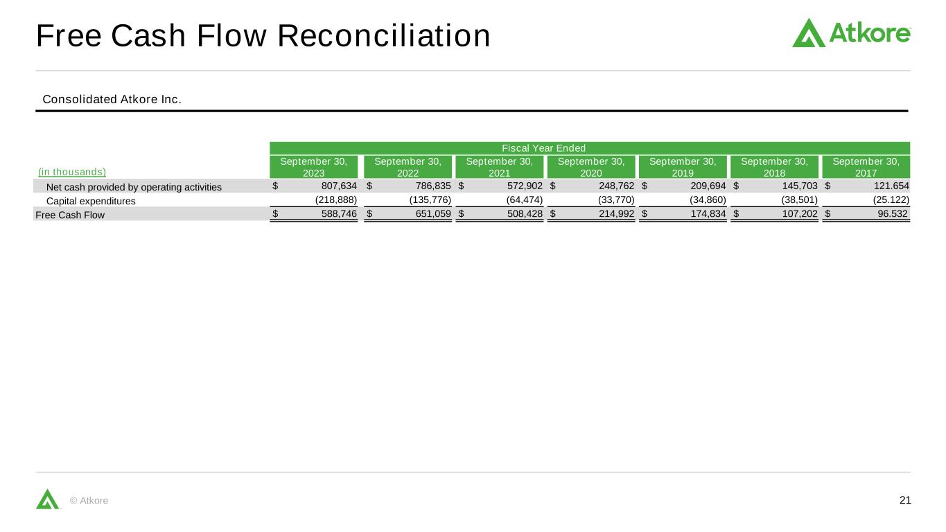 21© Atkore Free Cash Flow Reconciliation Consolidated Atkore Inc. Fiscal Year Ended (in thousands) September 30, 2023 September 30, 2022 September 30, 2021 September 30, 2020 September 30, 2019 September 30, 2018 September 30, 2017 Net cash provided by operating activities $ 807,634 $ 786,835 $ 572,902 $ 248,762 $ 209,694 $ 145,703 $ 121.654 Capital expenditures (218,888) (135,776) (64,474) (33,770) (34,860) (38,501) (25.122) Free Cash Flow $ 588,746 $ 651,059 $ 508,428 $ 214,992 $ 174,834 $ 107,202 $ 96.532