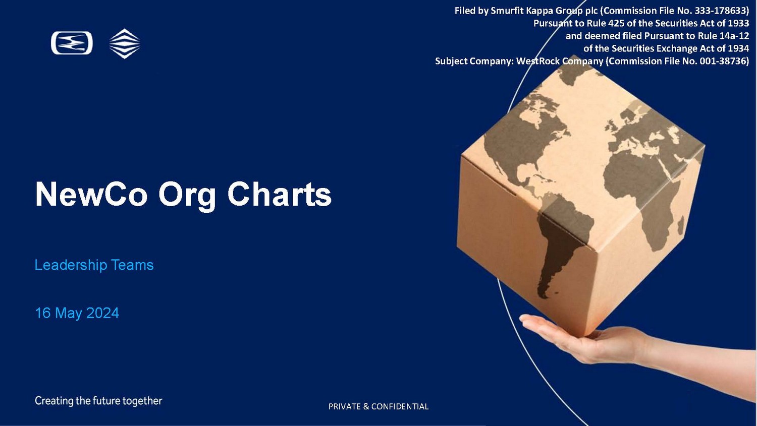 PRIVATE & CONFIDENTIAL NewCo Org Charts Leadership Teams 16 May 2024 Filed by Smurfit Kappa Group plc (Commission File No. 333 - 178633) Pursuant to Rule 425 of the Securities Act of 1933 and deemed filed Pursuant to Rule 14a - 12 of the Securities Exchange Act of 1934 Subject Company: WestRock Company (Commission File No. 001 - 38736 )