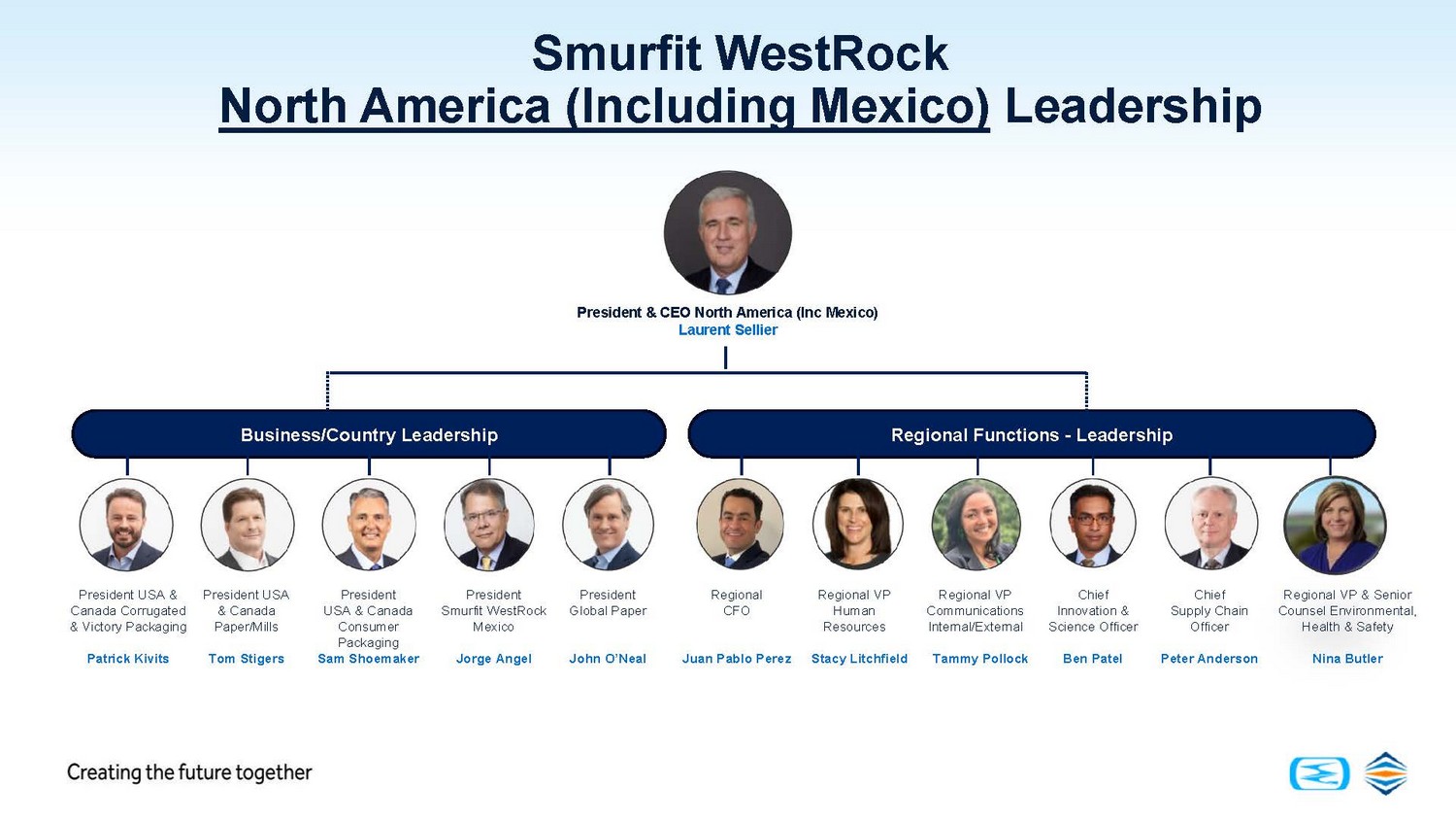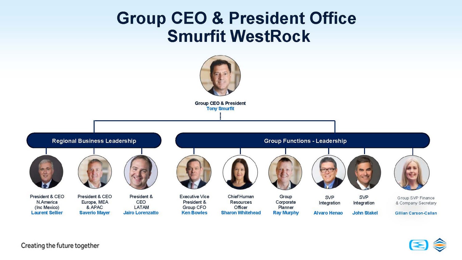 Group CEO & President Office Smurfit WestRock Group CEO & President Tony Smurfit President & CEO N.America (Inc Mexico) Laurent Sellier President & CEO Europe, MEA & APAC Saverio Mayer President & CEO LATAM Jairo Lorenzatto Executive Vice President & Group CFO Ken Bowles Chief Human Resources Officer Sharon Whitehead Group Corporate Planner Ray Murphy SVP Integration John Stakel Alvaro Henao Regional Business Leadership Group Functions - Leadership Group SVP Finance & Company Secretary Gillian Carson - Callan SVP Integration