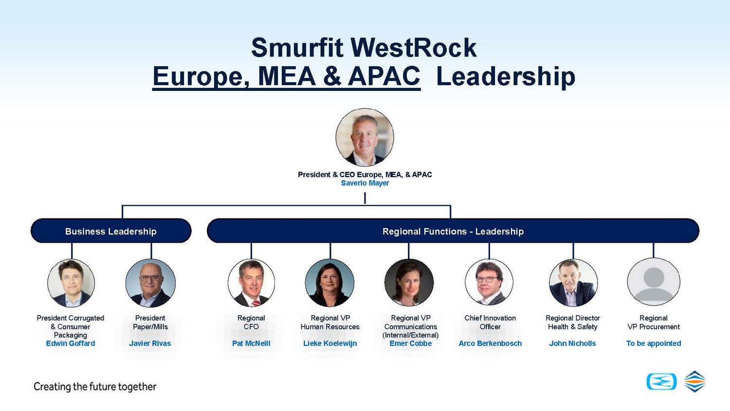 Smurfit WestRock Europe, MEA & APAC Leadership President & CEO Europe, MEA, & APAC Saverio Mayer Business Leadership Regional Functions - Leadership President Corrugated & Consumer Packaging Edwin Goffard President Paper/Mills Javier Rivas Regional CFO Pat McNeill Regional VP Human Resources Lieke Koelewijn Regional VP Communications (Internal/External) Emer Cobbe Chief Innovation Officer Arco Berkenbosch Regional Director Health & Safety John Nicholls Regional VP Procurement To be appointed