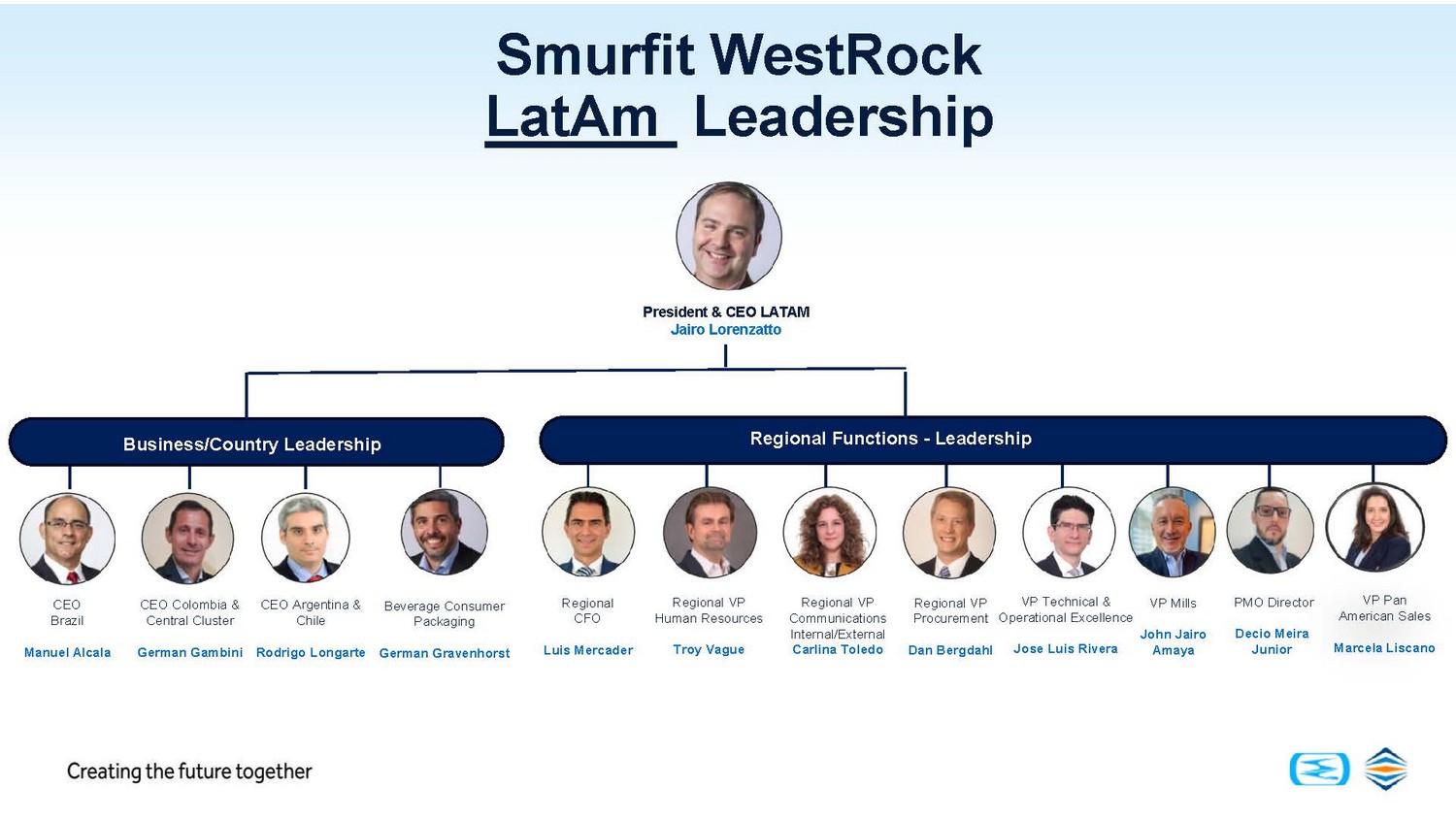 Smurfit WestRock LatAm Leadership President & CEO LATAM Jairo Lorenzatto Business/Country Leadership Regional Functions - Leadership CEO Brazil Manuel Alcala CEO Colombia & Central Cluster German Gambini CEO Argentina & Chile Rodrigo Longarte Regional CFO Luis Mercader Regional VP Human Resources Troy Vague Regional VP Communications Internal/External Carlina Toledo Regional VP Procurement Dan Bergdahl VP Technical & Operational Excellence Jose Luis Rivera VP Mills John Jairo Amaya PMO Director Decio Meira Junior Beverage Consumer Packaging German Gravenhorst VP Pan American Sales Marcela Liscano