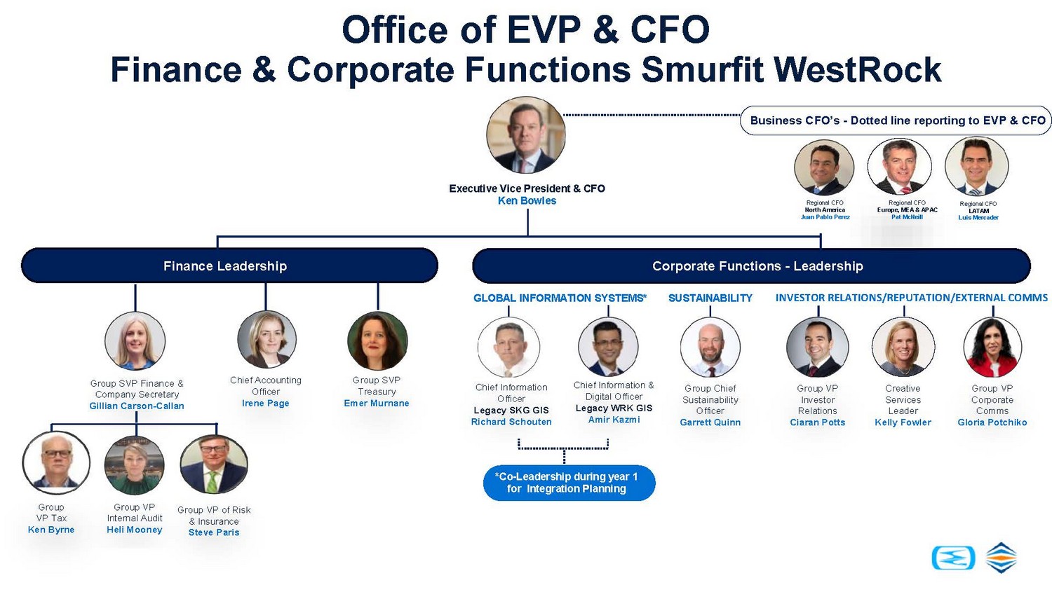 Office of EVP & CFO Finance & Corporate Functions Smurfit WestRock Executive Vice President & CFO Ken Bowles Finance Leadership Corporate Functions - Leadership Group SVP Finance & Company Secretary Gillian Carson - Callan Group SVP Treasury Emer Murnane Group VP Tax Ken Byrne Group VP Internal Audit Heli Mooney Chief Accounting Officer Irene Page Group VP of Risk & Insurance Steve Paris GLOBAL INFORMATION SYSTEMS* SUSTAINABILITY INVESTOR RELATIONS/REPUTATION / EXTERNAL COMMS Chief Information Officer Legacy SKG GIS Richard Schouten Chief Information & Digital Officer Legacy WRK GIS Amir Kazmi *Co - Leadership during year 1 for Integration Planning Group Chief Sustainability Officer Garrett Quinn Group VP Investor Relations Ciaran Potts Creative Services Leader Kelly Fowler Group VP Corporate Comms Gloria Potchiko Regional CFO North America Juan Pablo Perez Regional CFO Europe, MEA & APAC Pat McNeill Regional CFO LATAM Luis Mercader Business CFO’s - Dotted line reporting to EVP & CFO