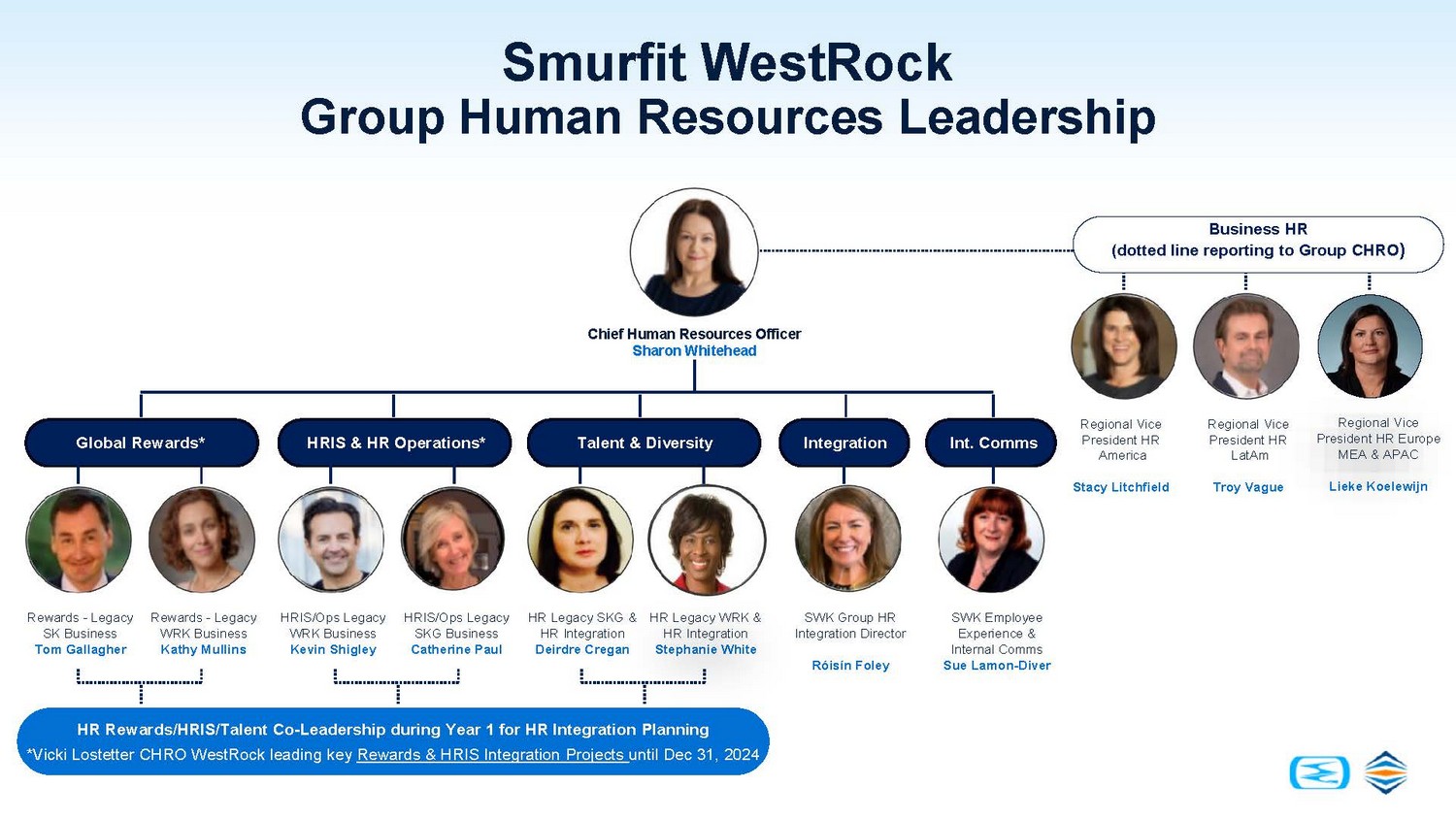 Smurfit WestRock Group Human Resources Leadership Chief Human Resources Officer Sharon Whitehead Rewards - Legacy SK Business Tom Gallagher Global Rewards* Rewards - Legacy WRK Business Kathy Mullins HRIS/Ops Legacy WRK Business Kevin Shigley HRIS & HR Operations* HRIS/Ops Legacy SKG Business Catherine Paul HR Legacy SKG & HR Integration Deirdre Cregan Talent & Diversity HR Legacy WRK & HR Integration Stephanie White SWK Group HR Integration Director Róisín Foley Integration Regional Vice President HR America Stacy Litchfield Business HR (dotted line reporting to Group CHRO ) SWK Employee Experience & Internal Comms Sue Lamon - Diver Int. Comms Regional Vice President HR LatAm Troy Vague HR Rewards/HRIS/Talent Co - Leadership during Year 1 for HR Integration Planning *Vicki Lostetter CHRO WestRock leading key Rewards & HRIS Integration Projects until Dec 31, 2024 Regional Vice President HR Europe MEA & APAC Lieke Koelewijn
