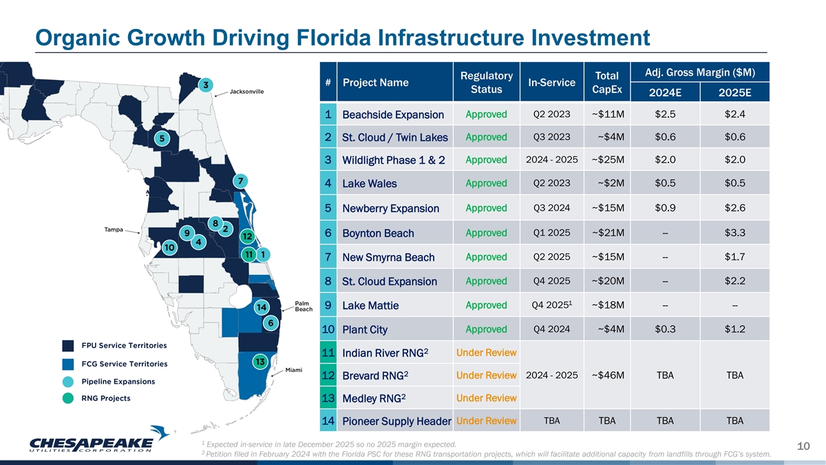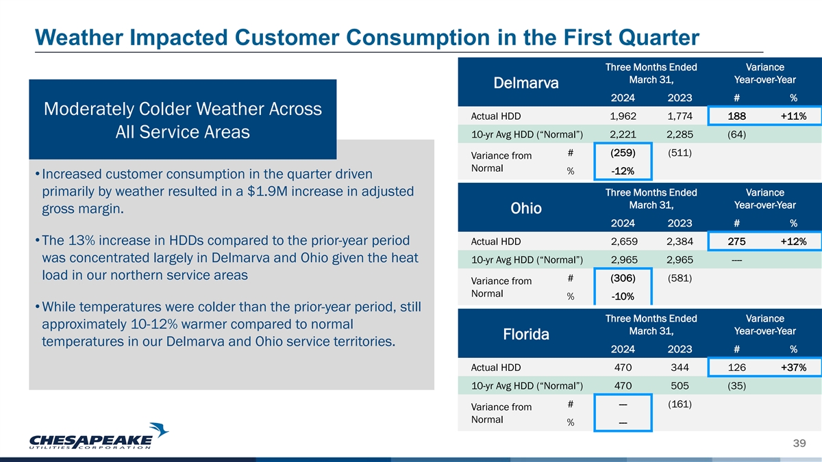Weather Impacted Customer Consumption in the First Quarter Three Months Ended Variance March 31, Year-over-Year Delmarva 2024 2023 # % Moderately Colder Weather Across Actual HDD 1,962 1,774 188 +11% All Service Areas 10-yr Avg HDD (“Normal”) 2,221 2,285 (64) # (259) (511) Variance from Normal % -12% • Increased customer consumption in the quarter driven primarily by weather resulted in a $1.9M increase in adjusted Three Months Ended Variance March 31, Year-over-Year gross margin. Ohio 2024 2023 # % Actual HDD 2,659 2,384 275 +12% • The 13% increase in HDDs compared to the prior-year period was concentrated largely in Delmarva and Ohio given the heat 10-yr Avg HDD (“Normal”) 2,965 2,965 ---- load in our northern service areas # (306) (581) Variance from Normal % -10% • While temperatures were colder than the prior-year period, still Three Months Ended Variance approximately 10-12% warmer compared to normal March 31, Year-over-Year Florida temperatures in our Delmarva and Ohio service territories. 2024 2023 # % Actual HDD 470 344 126 +37% 10-yr Avg HDD (“Normal”) 470 505 (35) # --- (161) Variance from Normal % --- 39