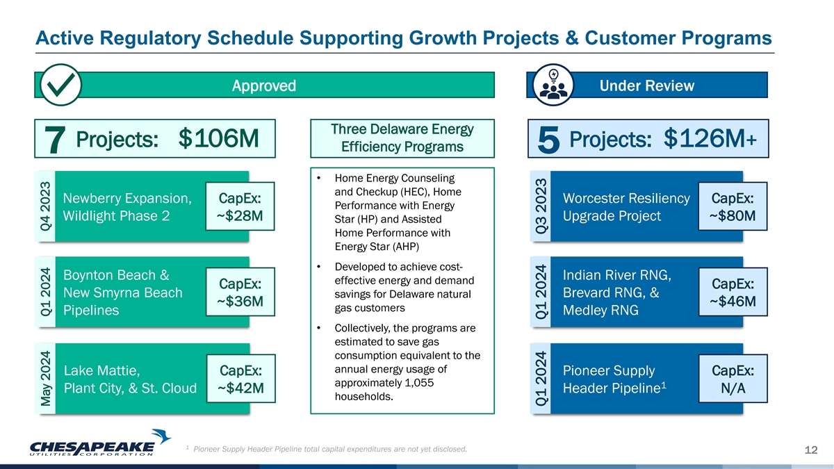Organic Growth Driving Investment in Delmarva Projects Adj. Gross Margin ($M) Regulatory Total # Project Name In-Service Status CapEx 2024E 2025E Q4 2023 1 Approved ~$14M $2.3 $2.3 Southern Expansion North Ocean City 1 1 Approved Q2 2023 ~$6M -- $0.5 2 Connector Worcester Resiliency Under Review Q3 2025 ~$80M TBA TBA 3 Upgrade Project A Deeper Dive: Worcester Resiliency Upgrade Project 500k gallons LNG storage and vaporization, 1.5-miles 10” CS, 4 M&R stations • $80 million planned liquefied natural gas storage facility in Bishopville, MD • Project consists of five low-profile horizontal storage tanks allowing for up to 500k gallons of storage plus pipeline looping and additional upgrades • Improvements will help protect against weather-related disruptions, keeping energy prices affordable • 30-year agreements with customers 1 11 Regulatory recovery through the Maryland General Rate Case so no margin impact in 2024.