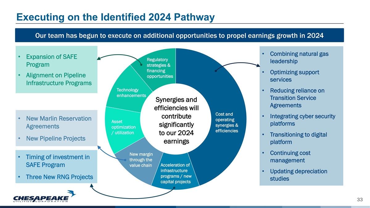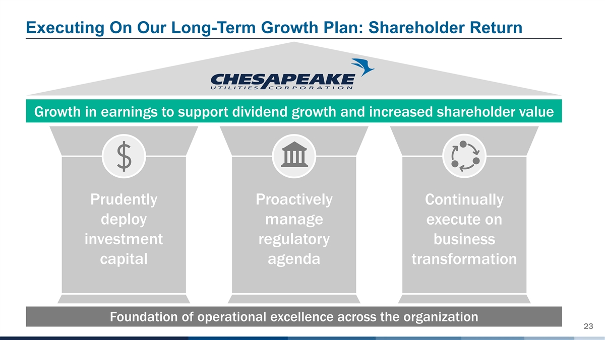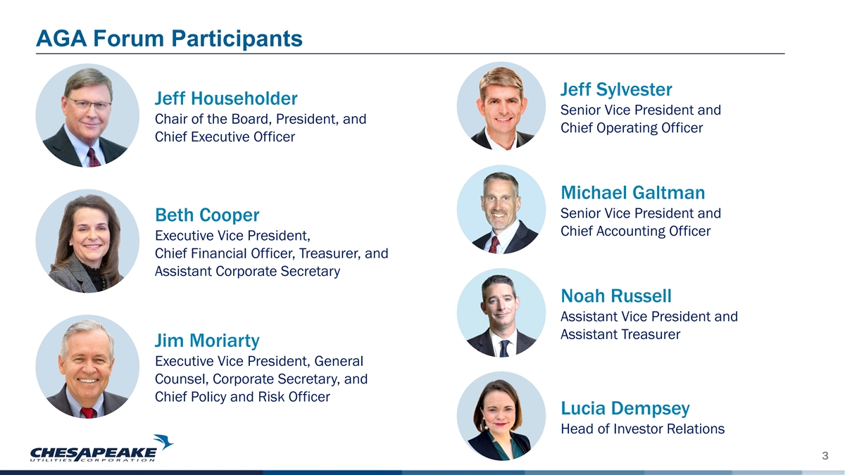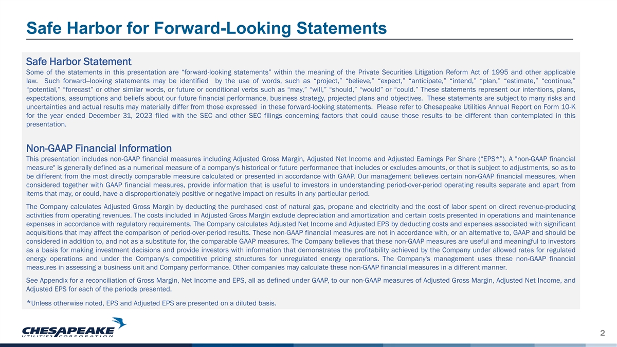 Safe Harbor for Forward-Looking Statements Safe Harbor Statement Some of the statements in this presentation are “forward-looking statements” within the meaning of the Private Securities Litigation Reform Act of 1995 and other applicable law. Such forward--looking statements may be identified by the use of words, such as “project,” “believe,” “expect,” “anticipate,” “intend,” “plan,” “estimate,” “continue,” “potential,” “forecast” or other similar words, or future or conditional verbs such as “may,” “will,” “should,” “would” or “could.” These statements represent our intentions, plans, expectations, assumptions and beliefs about our future financial performance, business strategy, projected plans and objectives. These statements are subject to many risks and uncertainties and actual results may materially differ from those expressed in these forward-looking statements. Please refer to Chesapeake Utilities Annual Report on Form 10-K for the year ended December 31, 2023 filed with the SEC and other SEC filings concerning factors that could cause those results to be different than contemplated in this presentation. Non-GAAP Financial Information This presentation includes non-GAAP financial measures including Adjusted Gross Margin, Adjusted Net Income and Adjusted Earnings Per Share (“EPS*”). A non-GAAP financial measure is generally defined as a numerical measure of a company's historical or future performance that includes or excludes amounts, or that is subject to adjustments, so as to be different from the most directly comparable measure calculated or presented in accordance with GAAP. Our management believes certain non-GAAP financial measures, when considered together with GAAP financial measures, provide information that is useful to investors in understanding period-over-period operating results separate and apart from items that may, or could, have a disproportionately positive or negative impact on results in any particular period. The Company calculates Adjusted Gross Margin by deducting the purchased cost of natural gas, propane and electricity and the cost of labor spent on direct revenue-producing activities from operating revenues. The costs included in Adjusted Gross Margin exclude depreciation and amortization and certain costs presented in operations and maintenance expenses in accordance with regulatory requirements. The Company calculates Adjusted Net Income and Adjusted EPS by deducting costs and expenses associated with significant acquisitions that may affect the comparison of period-over-period results. These non-GAAP financial measures are not in accordance with, or an alternative to, GAAP and should be considered in addition to, and not as a substitute for, the comparable GAAP measures. The Company believes that these non-GAAP measures are useful and meaningful to investors as a basis for making investment decisions and provide investors with information that demonstrates the profitability achieved by the Company under allowed rates for regulated energy operations and under the Company's competitive pricing structures for unregulated energy operations. The Company's management uses these non-GAAP financial measures in assessing a business unit and Company performance. Other companies may calculate these non-GAAP financial measures in a different manner. See Appendix for a reconciliation of Gross Margin, Net Income and EPS, all as defined under GAAP, to our non-GAAP measures of Adjusted Gross Margin, Adjusted Net Income, and Adjusted EPS for each of the periods presented. *Unless otherwise noted, EPS and Adjusted EPS are presented on a diluted basis. 2
