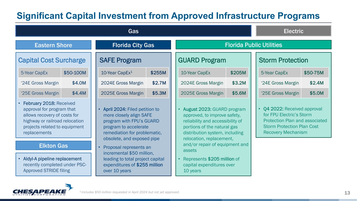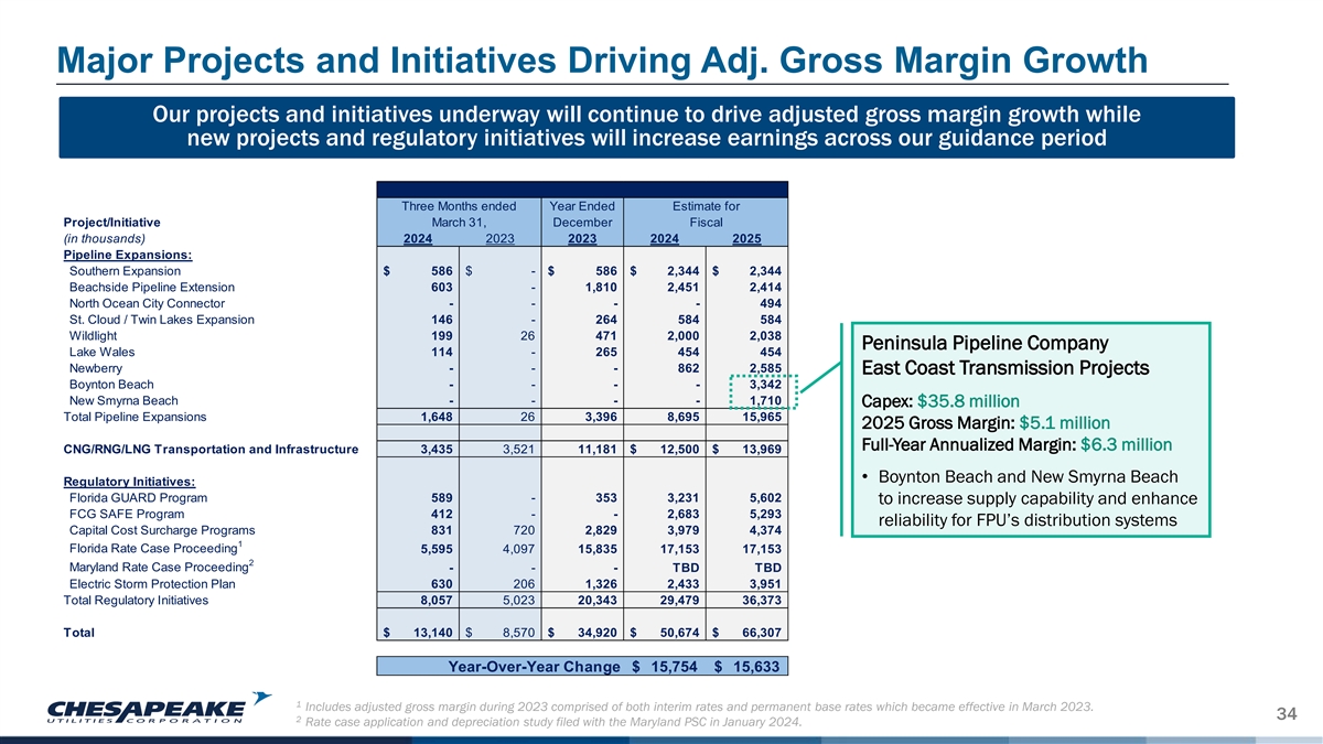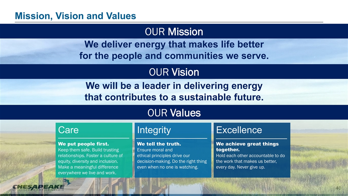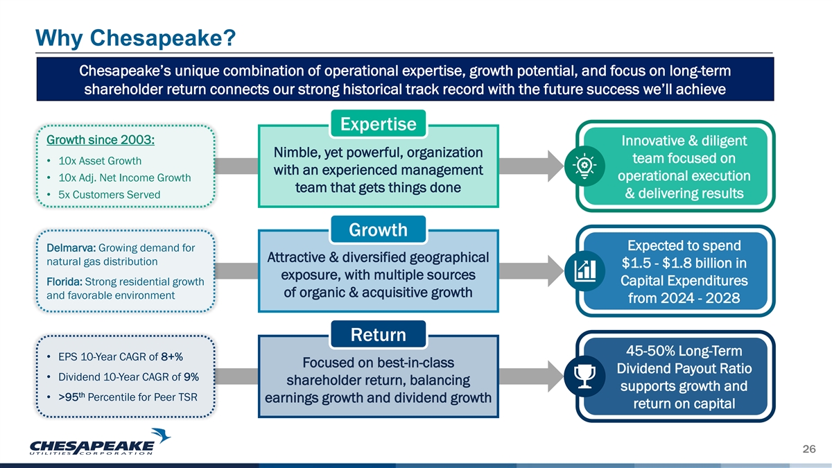 Safe Harbor for Forward-Looking Statements Safe Harbor Statement Some of the statements in this presentation are “forward-looking statements” within the meaning of the Private Securities Litigation Reform Act of 1995 and other applicable law. Such forward--looking statements may be identified by the use of words, such as “project,” “believe,” “expect,” “anticipate,” “intend,” “plan,” “estimate,” “continue,” “potential,” “forecast” or other similar words, or future or conditional verbs such as “may,” “will,” “should,” “would” or “could.” These statements represent our intentions, plans, expectations, assumptions and beliefs about our future financial performance, business strategy, projected plans and objectives. These statements are subject to many risks and uncertainties and actual results may materially differ from those expressed in these forward-looking statements. Please refer to Chesapeake Utilities Annual Report on Form 10-K for the year ended December 31, 2023 filed with the SEC and other SEC filings concerning factors that could cause those results to be different than contemplated in this presentation. Non-GAAP Financial Information This presentation includes non-GAAP financial measures including Adjusted Gross Margin, Adjusted Net Income and Adjusted Earnings Per Share (“EPS*”). A non-GAAP financial measure is generally defined as a numerical measure of a company's historical or future performance that includes or excludes amounts, or that is subject to adjustments, so as to be different from the most directly comparable measure calculated or presented in accordance with GAAP. Our management believes certain non-GAAP financial measures, when considered together with GAAP financial measures, provide information that is useful to investors in understanding period-over-period operating results separate and apart from items that may, or could, have a disproportionately positive or negative impact on results in any particular period. The Company calculates Adjusted Gross Margin by deducting the purchased cost of natural gas, propane and electricity and the cost of labor spent on direct revenue-producing activities from operating revenues. The costs included in Adjusted Gross Margin exclude depreciation and amortization and certain costs presented in operations and maintenance expenses in accordance with regulatory requirements. The Company calculates Adjusted Net Income and Adjusted EPS by deducting costs and expenses associated with significant acquisitions that may affect the comparison of period-over-period results. These non-GAAP financial measures are not in accordance with, or an alternative to, GAAP and should be considered in addition to, and not as a substitute for, the comparable GAAP measures. The Company believes that these non-GAAP measures are useful and meaningful to investors as a basis for making investment decisions and provide investors with information that demonstrates the profitability achieved by the Company under allowed rates for regulated energy operations and under the Company's competitive pricing structures for unregulated energy operations. The Company's management uses these non-GAAP financial measures in assessing a business unit and Company performance. Other companies may calculate these non-GAAP financial measures in a different manner. See Appendix for a reconciliation of Gross Margin, Net Income and EPS, all as defined under GAAP, to our non-GAAP measures of Adjusted Gross Margin, Adjusted Net Income, and Adjusted EPS for each of the periods presented. *Unless otherwise noted, EPS and Adjusted EPS are presented on a diluted basis. 2