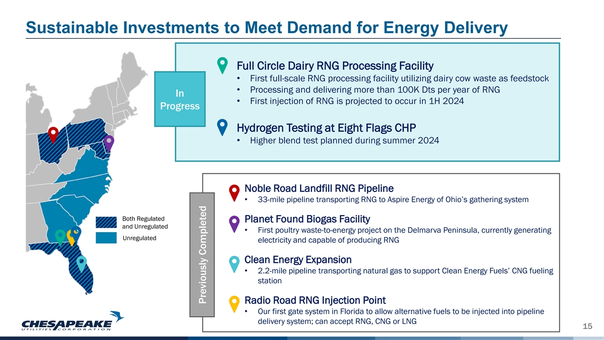 Drivers of Unregulated Business Growth Propane Distribution Marlin Gas Services Sustainable Investments • Strategic acquisitions and • Increased demand for CNG • Construction underway on first expansions within complementary services RNG facility at Full Circle Dairy markets and expansion of Planet Found • Service offerings to support RNG, site • Including J.T. Lee & Sons LNG and hydrogen transportation acquisition in 2023 • Introducing groundbreaking • Interim solution for construction technology - a self-contained • Investing in community gas projects providing speed to CNG/RNG fueled farm irrigation systems in areas not served by market and waste pumping unit at Full natural gas Circle Dairy • Integrating Sharp’s programs and • Member of the Mid-Atlantic Clean service offering to recent Hydrogen Hub (MACH2) team acquisitions (e.g., pricing representing the Delaware, programs, AutoGas, etc.) Philadelphia and Southern New Jersey region 14