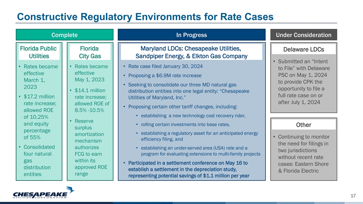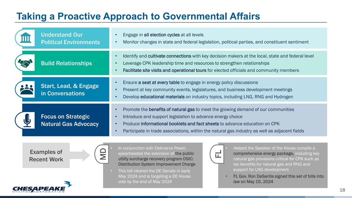 Constructive Regulatory Environments for Rate Cases Complete In Progress Under Consideration Florida Public Florida Maryland LDCs: Chesapeake Utilities, Delaware LDCs Utilities City Gas Sandpiper Energy, & Elkton Gas Company • Submitted an “Intent • Rate case filed January 30, 2024 • Rates became • Rates became to File” with Delaware effective effective PSC on May 1, 2024 • Proposing a $6.9M rate increase May 1, 2023 March 1, to provide CPK the • Seeking to consolidate our three MD natural gas 2023 opportunity to file a • $14.1 million distribution entities into one legal entity: “Chesapeake full rate case on or • $17.2 million rate increase; Utilities of Maryland, Inc.” after July 1, 2024 rate increase; allowed ROE of • Proposing certain other tariff changes, including: allowed ROE 8.5% -10.5% • establishing a new technology cost recovery rider, of 10.25% • Reserve and equity • rolling certain investments into base rates, Other surplus percentage • establishing a regulatory asset for an anticipated energy amortization • Continuing to monitor of 55% efficiency filing, and mechanism the need for filings in • Consolidated authorizes • establishing an under-served area (USA) rate and a two jurisdictions program for evaluating extensions to multi-family projects four natural FCG to earn without recent rate within its gas • Participated in a settlement conference on May 16 to cases: Eastern Shore approved ROE distribution establish a settlement in the depreciation study, & Florida Electric range entities representing potential savings of $1.1 million per year 17
