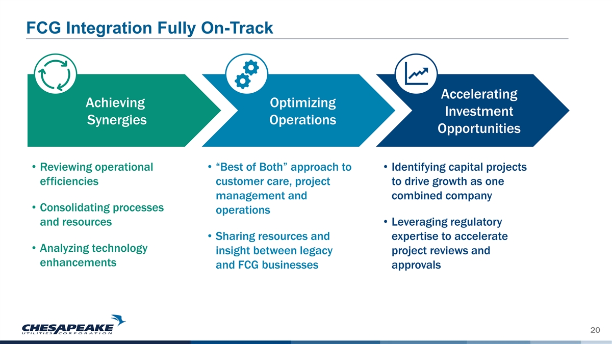 FCG Integration Fully On-Track Accelerating Achieving Optimizing Investment Synergies Operations Opportunities • Reviewing operational • “Best of Both” approach to • Identifying capital projects efficiencies customer care, project to drive growth as one management and combined company • Consolidating processes operations and resources • Leveraging regulatory • Sharing resources and expertise to accelerate • Analyzing technology insight between legacy project reviews and enhancements and FCG businesses approvals 20