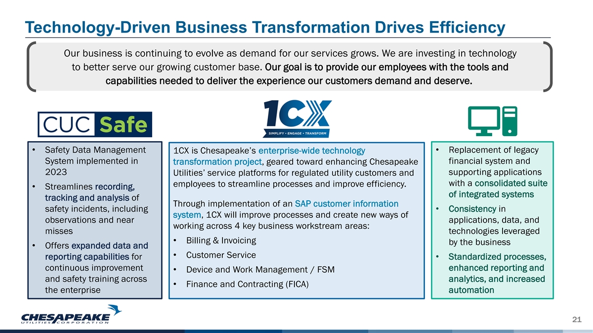 Technology-Driven Business Transformation Drives Efficiency Our business is continuing to evolve as demand for our services grows. We are investing in technology to better serve our growing customer base. Our goal is to provide our employees with the tools and capabilities needed to deliver the experience our customers demand and deserve. • Safety Data Management • Replacement of legacy 1CX is Chesapeake’s enterprise-wide technology System implemented in financial system and transformation project, geared toward enhancing Chesapeake 2023 supporting applications Utilities’ service platforms for regulated utility customers and with a consolidated suite employees to streamline processes and improve efficiency. • Streamlines recording, of integrated systems tracking and analysis of Through implementation of an SAP customer information safety incidents, including • Consistency in system, 1CX will improve processes and create new ways of observations and near applications, data, and working across 4 key business workstream areas: misses technologies leveraged • Billing & Invoicing by the business • Offers expanded data and • Customer Service reporting capabilities for • Standardized processes, continuous improvement enhanced reporting and • Device and Work Management / FSM and safety training across analytics, and increased • Finance and Contracting (FICA) the enterprise automation 21