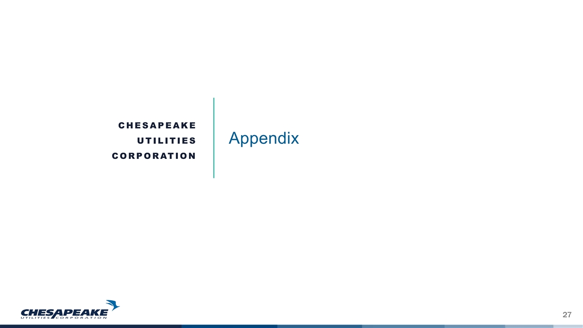 Why Chesapeake? Chesapeake’s unique combination of operational expertise, growth potential, and focus on long-term shareholder return connects our strong historical track record with the future success we’ll achieve Expertise Growth since 2003: Innovative & diligent Nimble, yet powerful, organization team focused on • 10x Asset Growth with an experienced management operational execution • 10x Adj. Net Income Growth team that gets things done • 5x Customers Served & delivering results Growth Expected to spend Delmarva: Growing demand for Attractive & diversified geographical natural gas distribution $1.5 - $1.8 billion in exposure, with multiple sources Florida: Strong residential growth Capital Expenditures of organic & acquisitive growth and favorable environment from 2024 - 2028 Return 45-50% Long-Term • EPS 10-Year CAGR of 8+% Focused on best-in-class Dividend Payout Ratio • Dividend 10-Year CAGR of 9% shareholder return, balancing supports growth and th • >95 Percentile for Peer TSR earnings growth and dividend growth return on capital 26
