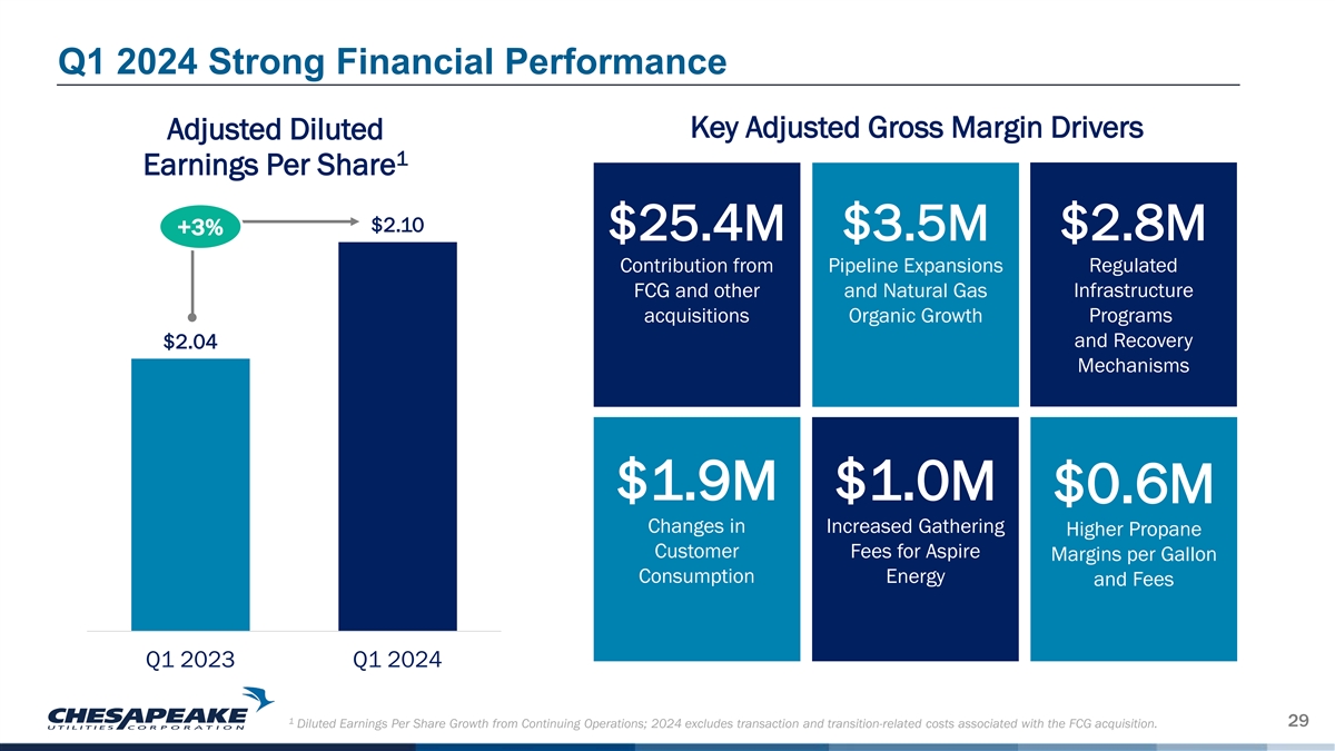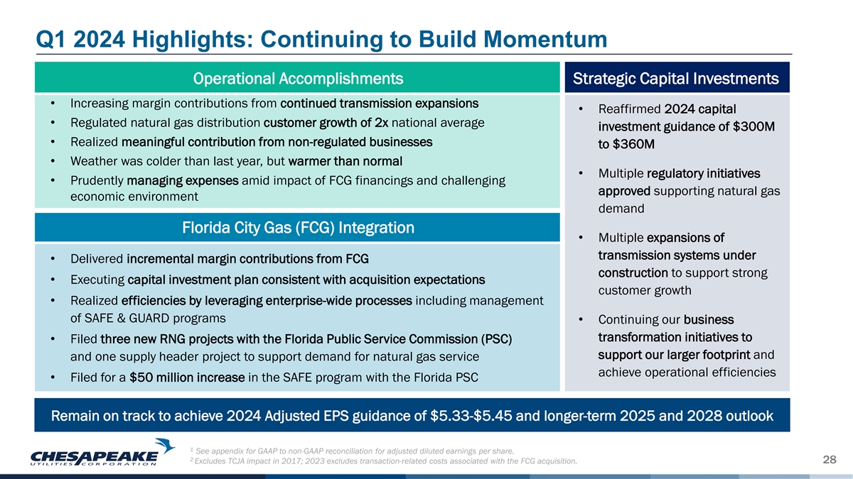 Q1 2024 Highlights: Continuing to Build Momentum Operational Accomplishments Strategic Capital Investments • Increasing margin contributions from continued transmission expansions • Reaffirmed 2024 capital • Regulated natural gas distribution customer growth of 2x national average investment guidance of $300M • Realized meaningful contribution from non-regulated businesses to $360M • Weather was colder than last year, but warmer than normal • Multiple regulatory initiatives • Prudently managing expenses amid impact of FCG financings and challenging approved supporting natural gas economic environment demand Florida City Gas (FCG) Integration • Multiple expansions of transmission systems under • Delivered incremental margin contributions from FCG construction to support strong • Executing capital investment plan consistent with acquisition expectations customer growth • Realized efficiencies by leveraging enterprise-wide processes including management of SAFE & GUARD programs • Continuing our business transformation initiatives to • Filed three new RNG projects with the Florida Public Service Commission (PSC) support our larger footprint and and one supply header project to support demand for natural gas service achieve operational efficiencies • Filed for a $50 million increase in the SAFE program with the Florida PSC Remain on track to achieve 2024 Adjusted EPS guidance of $5.33-$5.45 and longer-term 2025 and 2028 outlook 1 See appendix for GAAP to non-GAAP reconciliation for adjusted diluted earnings per share. 2 28 Excludes TCJA impact in 2017; 2023 excludes transaction-related costs associated with the FCG acquisition.