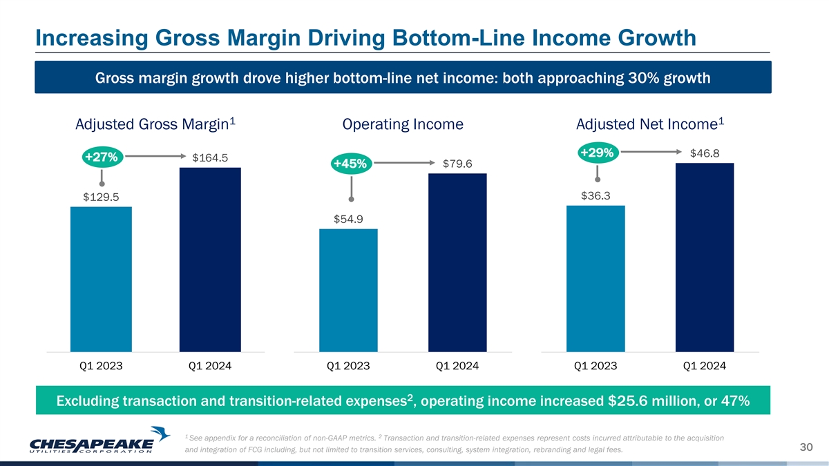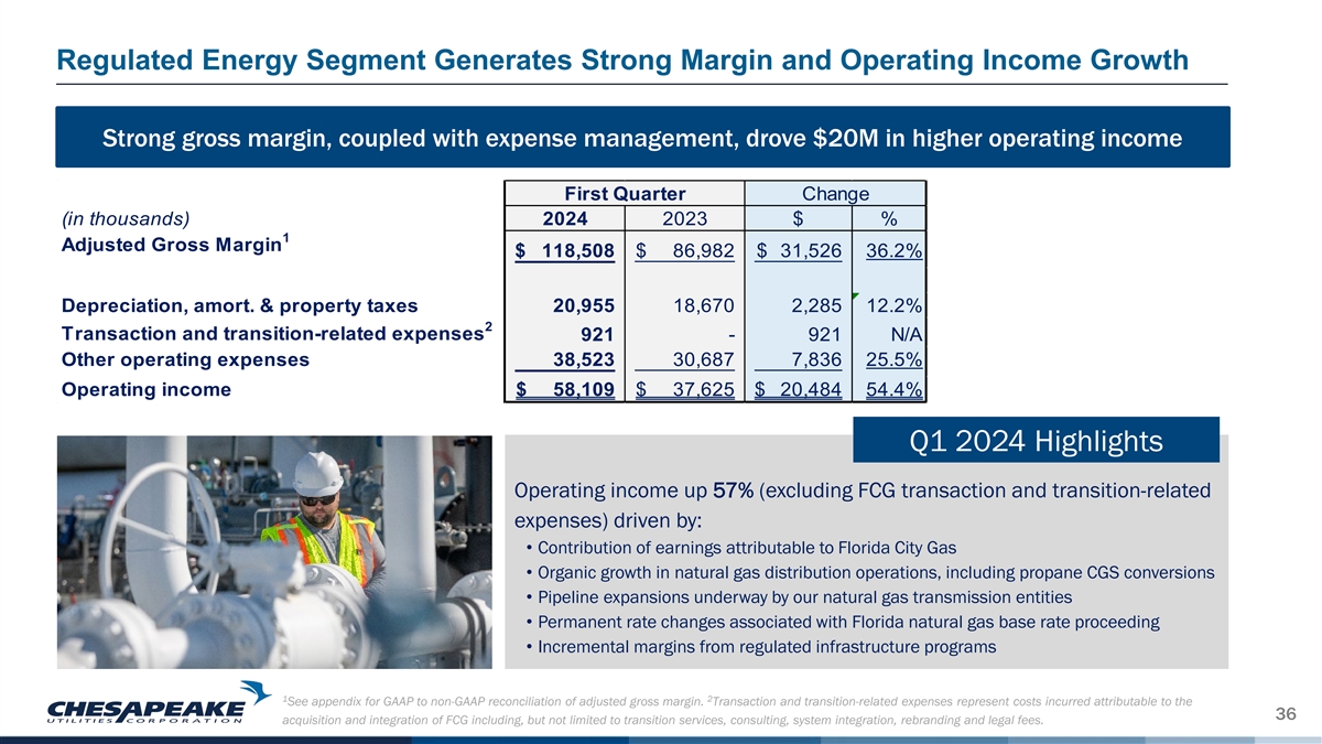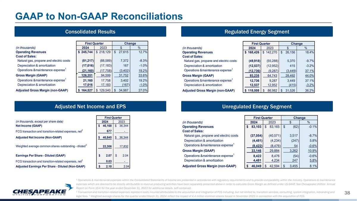 GAAP to Non-GAAP Reconciliations Consolidated Results Regulated Energy Segment First Quarter Change First Quarter Change (in thousands) 2024 2023 $ % (in thousands) 2024 2023 $ % Operating Revenues $ 245, 744 $ 218,129 $ 27, 615 12.7% Operating Revenues $ 168,426 $ 142, 270 $ 26,156 18.4% Cost of Sales: Cost of Sales: Natural gas, propane and electric costs ( 81,217) (88,589) 7, 372 -8.3% Natural gas, propane and electric costs (49,918) (55,288) 5, 370 -9.7% Depreciation & amortization ( 17,016) ( 17,183) 167 -1.0% Depreciation & amortization (12,537) ( 12,952) 415 -3.2% 1 1 Operations &maintenance expense Operations &maintenance expense ( 21,160) (17,758) ( 3,402) 19.2% ( 12,736) ( 9,287) (3,449) 37.1% Gross Margin (GAAP) 126, 351 94, 599 31, 752 33.6% Gross Margin (GAAP) 93, 235 64, 743 28, 492 44.0% 1 1 Operations &maintenance expense 21, 160 17,758 3,402 19.2% Operations &maintenance expense 12, 736 9, 287 3, 449 37.1% Depreciation & amortization 17, 016 17, 183 (167) -1.0% Depreciation & amortization 12,537 12,952 (415) -3.2% Adjusted Gross Margin (non-GAAP) $ 164,527 $ 129,540 $ 34, 987 27.0% Adjusted Gross Margin (non-GAAP) $ 118,508 $ 86,982 $ 31,526 36.2% Adjusted Net Income and EPS Unregulated Energy Segment First Quarter First Quarter Change (in thousands, except per share data) 2024 2023 (in thousands) 2024 2023 $ % Net Income (GAAP) $ 46,168 $ 36,344 Operating Revenues $ 83,103 $ 83,165 $ (62) -0.1% 2 677 - Cost of Sales: FCG transaction and transition-related expenses, net Natural gas, propane and electric costs (37,054) ( 40,571) 3, 517 -8.7% Adjusted Net Income (Non-GAAP) $ 46, 845 $ 36, 344 Depreciation & amortization (4,481) ( 4,234) ( 247) 5.8% 1 3 Operations &maintenance expense (8,422) (8,476) 54 -0.6% Weighted average common shares outstanding - diluted 22, 306 17, 832 Gross Margin (GAAP) 33,146 29,884 3, 262 10.9% 1 Earnings Per Share - Diluted (GAAP) $ 2.07 $ 2.04 Operations &maintenance expense 8, 422 8, 476 ( 54) -0.6% 2 Depreciation & amortization 4, 481 4, 234 247 5.8% 0. 03 - FCG transaction and transition-related expenses, net Adjusted Gross Margin (non-GAAP) $ 46, 049 $ 42,594 $ 3,455 8.1% Adjusted Earnings Per Share - Diluted (Non-GAAP) $ 2.10 2.04 1 Operations & maintenance expenses within the Consolidated Statements of Income are presented in accordance with regulatory requirements and to provide comparability within the industry. Operations & maintenance expenses which are deemed to be directly attributable to revenue producing activities have been separately presented above in order to calculate Gross Margin as defined under US GAAP. See Chesapeake Utilities’ Annual Report on Form 10-K for the year ended December 31, 2023 for additional details. self-contained. 2 Transaction and transition-related expenses represent costs incurred attributable to the acquisition and integration of FCG including, but not limited to, transition services, consulting, system integration, rebranding and 38 3 legal fees. Weighted average shares for the quarter ended March 31, 2024 reflect the impact of 4.4 million common shares issued in November 2023 in connection with the acquisition of FCG.