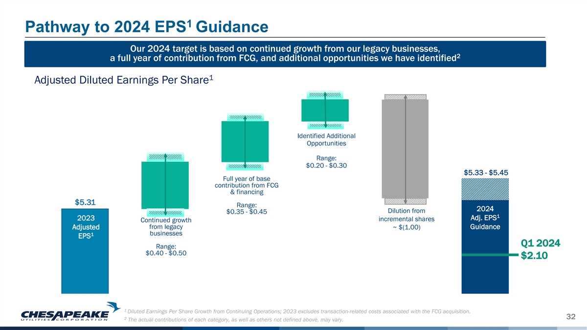 Key Drivers of Performance – Three Months Ended March 31, 2024 Our core business performance, strong customer demand and recent acquisition of Florida City Gas drove increased earnings per share, only partially offset by financing costs related to the FCG acquisition. 1 Adjusted Diluted Earnings Per Share Lower Depreciation, Increase in legacy amortization legacy business and property business operating Legacy 2 tax costs customer expenses Florida City business consumption Gas (excluding growth 3 acquisition FCG) (Excluding Interest weather and other & FCG) changes shares Q1 Q1 outstanding Contribution 2024 2023 Absence of due to from recent equity Reduction acquisitions offerings in state tax rate 1 See appendix for GAAP to non-GAAP reconciliation for adjusted diluted earnings per share. 2 Includes a benefit from RSAM of $3.4 million, pre-tax, or $0.11 per share. 31 3 Does not include RSAM benefit, which is included in depreciation expense.