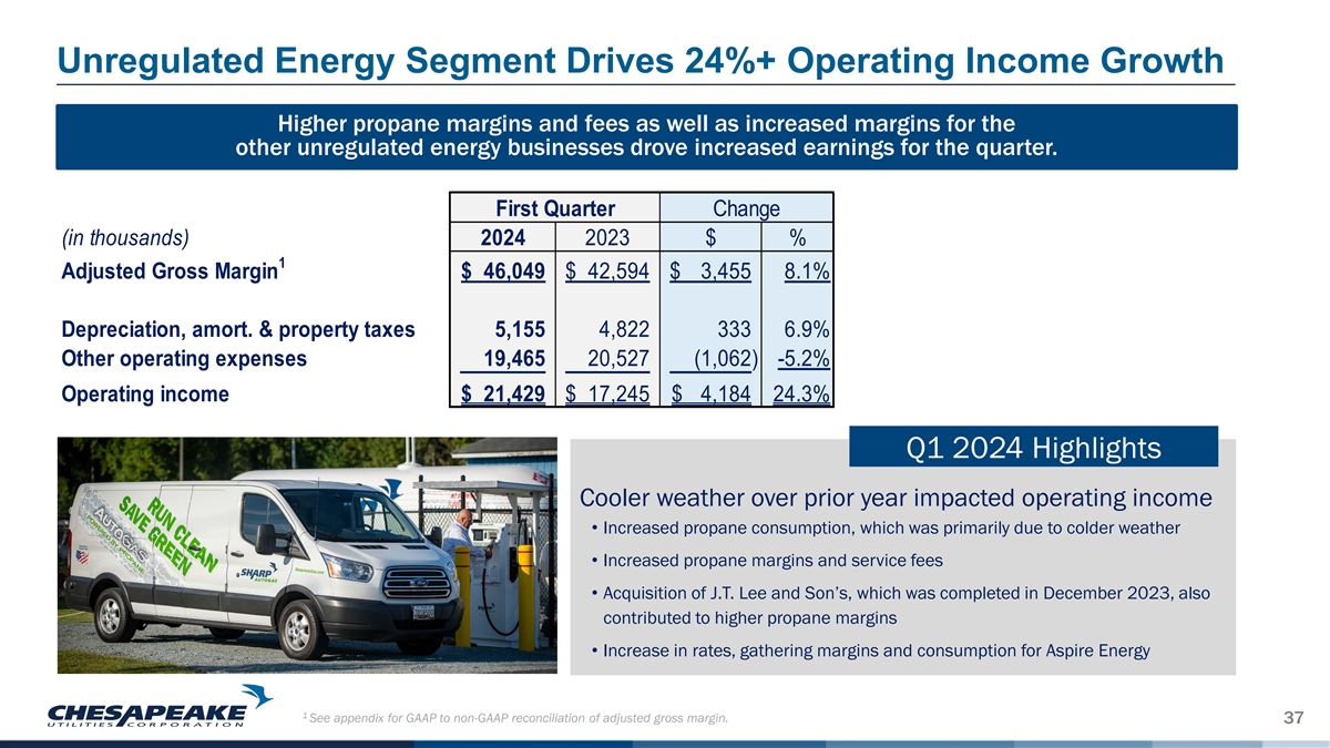 Regulated Energy Segment Generates Strong Margin and Operating Income Growth Strong gross margin, coupled with expense management, drove $20M in higher operating income First Quarter Change (in thousands) 2024 2023 $ % 1 Adjusted Gross Margin $ 118,508 $ 86, 982 $ 31,526 36.2% Depreciation, amort. & property taxes 20,955 18,670 2,285 12.2% 2 Transaction and transition-related expenses 921 - 921 N/A Other operating expenses 38, 523 30,687 7,836 25.5% Operating income $ 58,109 $ 37,625 $ 20,484 54.4% Q1 2024 Highlights Operating income up 57% (excluding FCG transaction and transition-related expenses) driven by: • Contribution of earnings attributable to Florida City Gas • Organic growth in natural gas distribution operations, including propane CGS conversions • Pipeline expansions underway by our natural gas transmission entities • Permanent rate changes associated with Florida natural gas base rate proceeding • Incremental margins from regulated infrastructure programs 1 2 See appendix for GAAP to non-GAAP reconciliation of adjusted gross margin. Transaction and transition-related expenses represent costs incurred attributable to the 36 acquisition and integration of FCG including, but not limited to transition services, consulting, system integration, rebranding and legal fees.