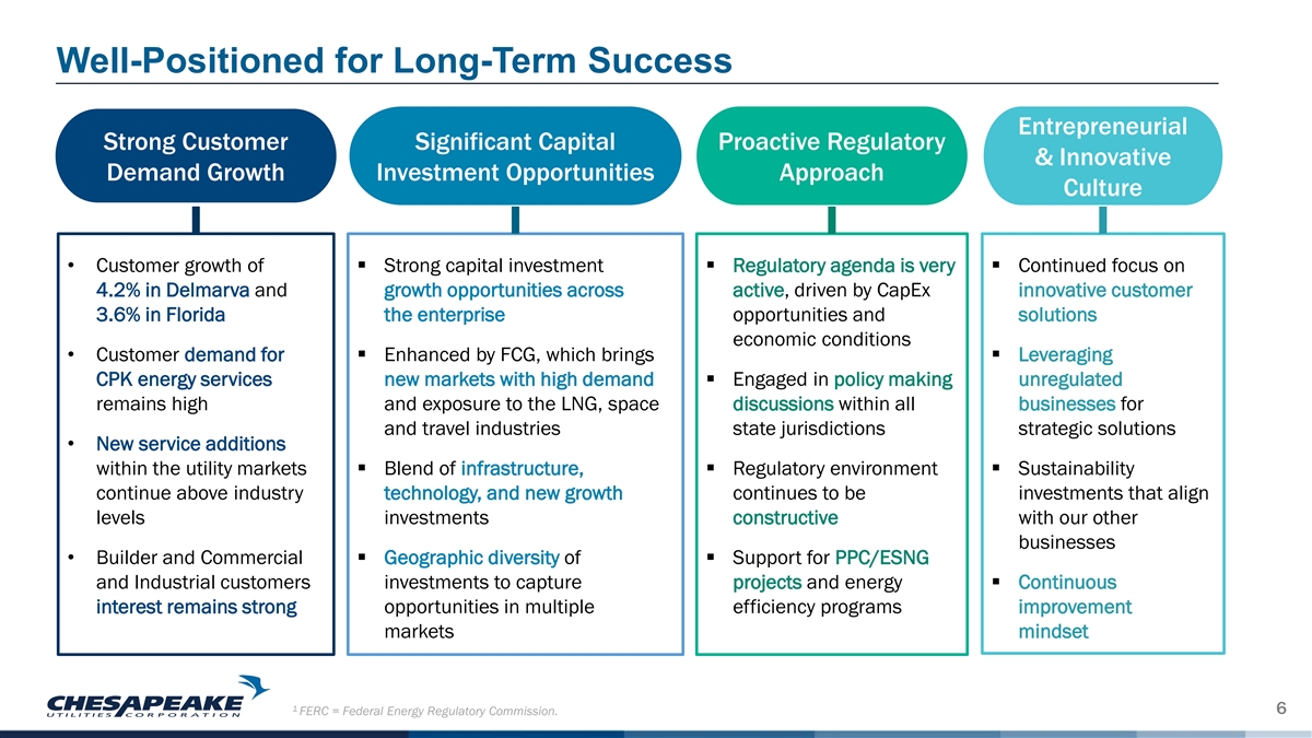 Well-Positioned for Long-Term Success Entrepreneurial Strong Customer Significant Capital Proactive Regulatory & Innovative Demand Growth Investment Opportunities Approach Culture • Customer growth of § Strong capital investment § Regulatory agenda is very § Continued focus on 4.2% in Delmarva and growth opportunities across active, driven by CapEx innovative customer 3.6% in Florida the enterprise opportunities and solutions economic conditions • Customer demand for § Enhanced by FCG, which brings § Leveraging CPK energy services new markets with high demand § Engaged in policy making unregulated remains high and exposure to the LNG, space discussions within all businesses for and travel industries state jurisdictions strategic solutions • New service additions within the utility markets § Blend of infrastructure, § Regulatory environment § Sustainability continue above industry technology, and new growth continues to be investments that align levels investments constructive with our other businesses • Builder and Commercial § Geographic diversity of § Support for PPC/ESNG and Industrial customers investments to capture projects and energy § Continuous interest remains strong opportunities in multiple efficiency programs improvement markets mindset 1 6 FERC = Federal Energy Regulatory Commission.