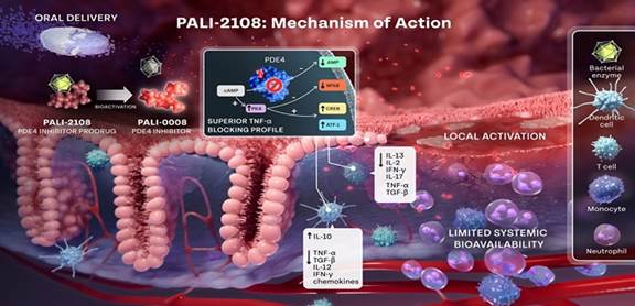 PALI-2108, our lead asset, is currently in the pre-clinical stage of development. We have commenced pivotal pre-clinical studies and anticipate commencing Phase 1 clinical trials during the fourth quarter of 2024. PALI-2108 is a prodrug PDE4 inhibitor that operates through a sophisticated mechanism within colon tissues, targeting the key enzyme phosphodiesterase-4 (PDE4). This enzyme is pivotal in cAMP hydrolysis, and by inhibiting PDE4, intracellular cAMP levels are elevated. This elevation leads to the downregulation of inflammatory cytokines and a reduction in the expression of cell adhesion molecules. By modulating these processes, PALI-2108 effectively prevents the local infiltration and activation of inflammatory cells in the colon tissues, offering a targeted approach for UC treatment. With a galactose-derived sugar moiety, PALI-2108 remains minimally absorbed until activated by the colonic bacterium enzyme β-glucuronidase. This prodrug exhibits colon preference, as demonstrated in DSS-induced UC mouse models and oxazolone colitis-induced mice, showcasing its localized bioactivation and colon-specific distribution.
