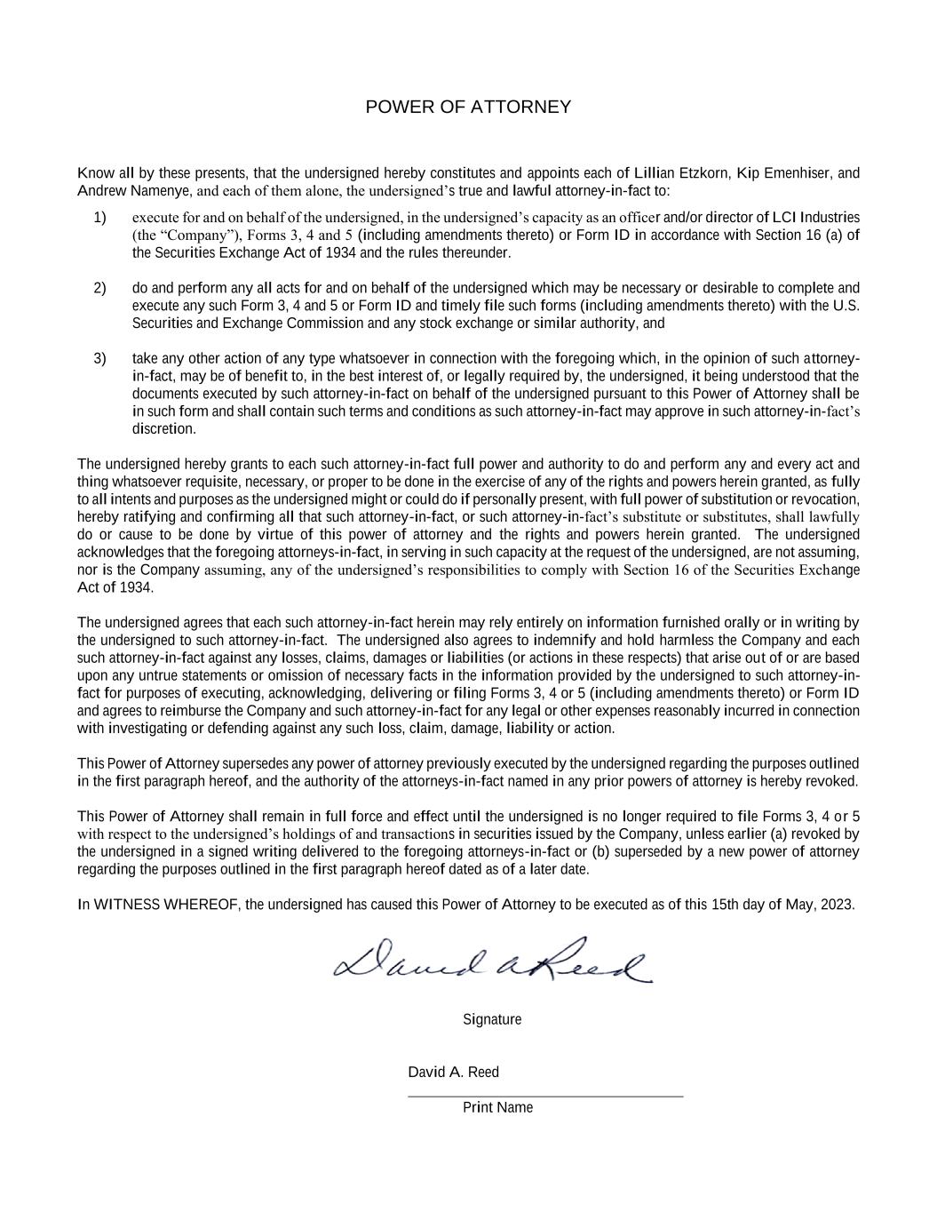 POWER OF ATTORNEY Know all by these presents, that the undersigned hereby constitutes and appoints each of Lillian Etzkorn, Kip Emenhiser, and Andrew Namenye, and each of them alone, the undersigned’s true and lawful attorney-in-fact to: 1) execute for and on behalf of the undersigned, in the undersigned’s capacity as an officer and/or director of LCI Industries (the “Company”), Forms 3, 4 and 5 (including amendments thereto) or Form ID in accordance with Section 16 (a) of the Securities Exchange Act of 1934 and the rules thereunder. 2) do and perform any all acts for and on behalf of the undersigned which may be necessary or desirable to complete and execute any such Form 3, 4 and 5 or Form ID and timely file such forms (including amendments thereto) with the U.S. Securities and Exchange Commission and any stock exchange or similar authority, and 3) take any other action of any type whatsoever in connection with the foregoing which, in the opinion of such attorney- in-fact, may be of benefit to, in the best interest of, or legally required by, the undersigned, it being understood that the documents executed by such attorney-in-fact on behalf of the undersigned pursuant to this Power of Attorney shall be in such form and shall contain such terms and conditions as such attorney-in-fact may approve in such attorney-in-fact’s discretion. The undersigned hereby grants to each such attorney-in-fact full power and authority to do and perform any and every act and thing whatsoever requisite, necessary, or proper to be done in the exercise of any of the rights and powers herein granted, as fully to all intents and purposes as the undersigned might or could do if personally present, with full power of substitution or revocation, hereby ratifying and confirming all that such attorney-in-fact, or such attorney-in-fact’s substitute or substitutes, shall lawfully do or cause to be done by virtue of this power of attorney and the rights and powers herein granted. The undersigned acknowledges that the foregoing attorneys-in-fact, in serving in such capacity at the request of the undersigned, are not assuming, nor is the Company assuming, any of the undersigned’s responsibilities to comply with Section 16 of the Securities Exchange Act of 1934. The undersigned agrees that each such attorney-in-fact herein may rely entirely on information furnished orally or in writing by the undersigned to such attorney-in-fact. The undersigned also agrees to indemnify and hold harmless the Company and each such attorney-in-fact against any losses, claims, damages or liabilities (or actions in these respects) that arise out of or are based upon any untrue statements or omission of necessary facts in the information provided by the undersigned to such attorney-in- fact for purposes of executing, acknowledging, delivering or filing Forms 3, 4 or 5 (including amendments thereto) or Form ID and agrees to reimburse the Company and such attorney-in-fact for any legal or other expenses reasonably incurred in connection with investigating or defending against any such loss, claim, damage, liability or action. This Power of Attorney supersedes any power of attorney previously executed by the undersigned regarding the purposes outlined in the first paragraph hereof, and the authority of the attorneys-in-fact named in any prior powers of attorney is hereby revoked. This Power of Attorney shall remain in full force and effect until the undersigned is no longer required to file Forms 3, 4 or 5 with respect to the undersigned’s holdings of and transactions in securities issued by the Company, unless earlier (a) revoked by the undersigned in a signed writing delivered to the foregoing attorneys-in-fact or (b) superseded by a new power of attorney regarding the purposes outlined in the first paragraph hereof dated as of a later date. In WITNESS WHEREOF, the undersigned has caused this Power of Attorney to be executed as of this 15th day of May, 2023. Signature David A. Reed Print Name