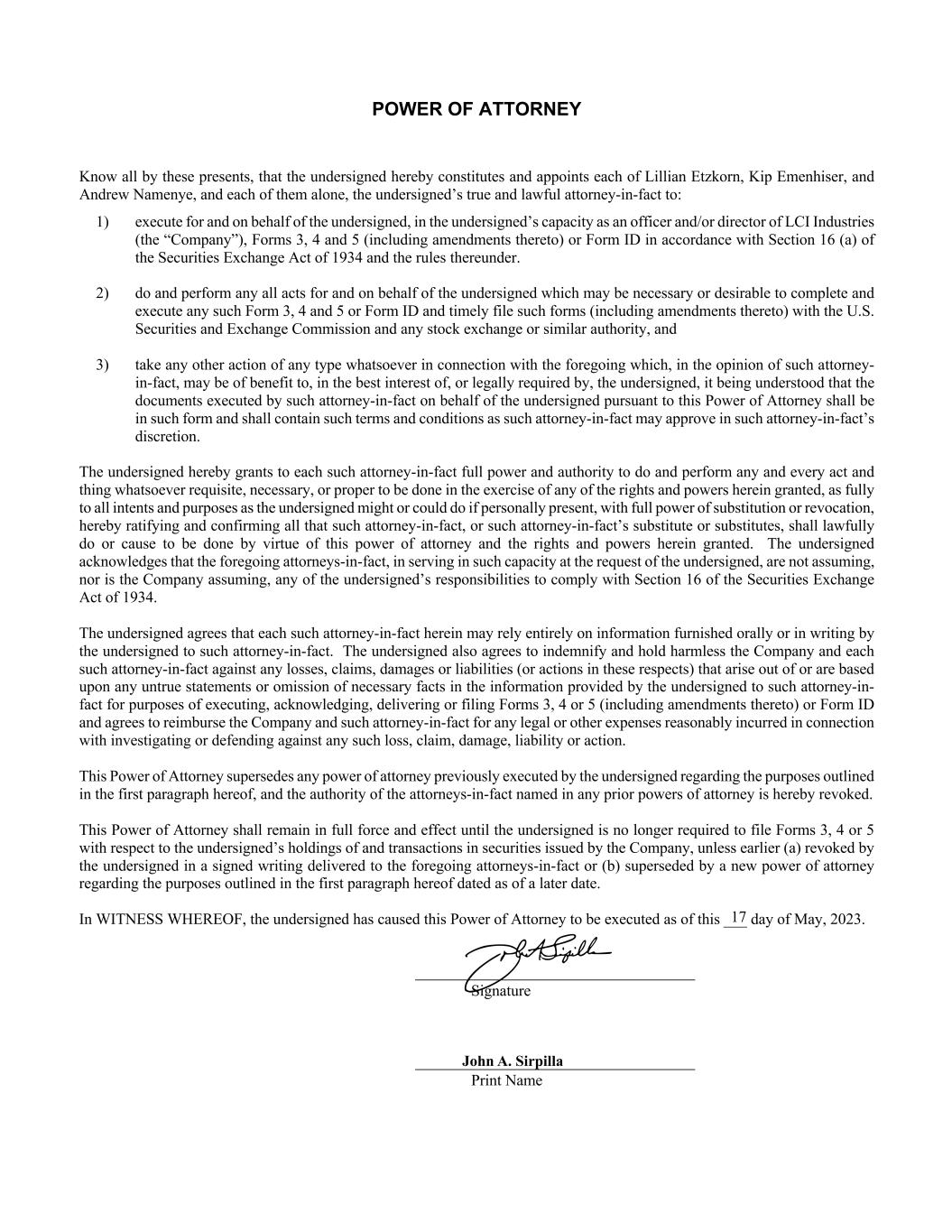 POWER OF ATTORNEY Know all by these presents, that the undersigned hereby constitutes and appoints each of Lillian Etzkorn, Kip Emenhiser, and Andrew Namenye, and each of them alone, the undersigned’s true and lawful attorney-in-fact to: 1) execute for and on behalf of the undersigned, in the undersigned’s capacity as an officer and/or director of LCI Industries (the “Company”), Forms 3, 4 and 5 (including amendments thereto) or Form ID in accordance with Section 16 (a) of the Securities Exchange Act of 1934 and the rules thereunder. 2) do and perform any all acts for and on behalf of the undersigned which may be necessary or desirable to complete and execute any such Form 3, 4 and 5 or Form ID and timely file such forms (including amendments thereto) with the U.S. Securities and Exchange Commission and any stock exchange or similar authority, and 3) take any other action of any type whatsoever in connection with the foregoing which, in the opinion of such attorney- in-fact, may be of benefit to, in the best interest of, or legally required by, the undersigned, it being understood that the documents executed by such attorney-in-fact on behalf of the undersigned pursuant to this Power of Attorney shall be in such form and shall contain such terms and conditions as such attorney-in-fact may approve in such attorney-in-fact’s discretion. The undersigned hereby grants to each such attorney-in-fact full power and authority to do and perform any and every act and thing whatsoever requisite, necessary, or proper to be done in the exercise of any of the rights and powers herein granted, as fully to all intents and purposes as the undersigned might or could do if personally present, with full power of substitution or revocation, hereby ratifying and confirming all that such attorney-in-fact, or such attorney-in-fact’s substitute or substitutes, shall lawfully do or cause to be done by virtue of this power of attorney and the rights and powers herein granted. The undersigned acknowledges that the foregoing attorneys-in-fact, in serving in such capacity at the request of the undersigned, are not assuming, nor is the Company assuming, any of the undersigned’s responsibilities to comply with Section 16 of the Securities Exchange Act of 1934. The undersigned agrees that each such attorney-in-fact herein may rely entirely on information furnished orally or in writing by the undersigned to such attorney-in-fact. The undersigned also agrees to indemnify and hold harmless the Company and each such attorney-in-fact against any losses, claims, damages or liabilities (or actions in these respects) that arise out of or are based upon any untrue statements or omission of necessary facts in the information provided by the undersigned to such attorney-in- fact for purposes of executing, acknowledging, delivering or filing Forms 3, 4 or 5 (including amendments thereto) or Form ID and agrees to reimburse the Company and such attorney-in-fact for any legal or other expenses reasonably incurred in connection with investigating or defending against any such loss, claim, damage, liability or action. This Power of Attorney supersedes any power of attorney previously executed by the undersigned regarding the purposes outlined in the first paragraph hereof, and the authority of the attorneys-in-fact named in any prior powers of attorney is hereby revoked. This Power of Attorney shall remain in full force and effect until the undersigned is no longer required to file Forms 3, 4 or 5 with respect to the undersigned’s holdings of and transactions in securities issued by the Company, unless earlier (a) revoked by the undersigned in a signed writing delivered to the foregoing attorneys-in-fact or (b) superseded by a new power of attorney regarding the purposes outlined in the first paragraph hereof dated as of a later date. In WITNESS WHEREOF, the undersigned has caused this Power of Attorney to be executed as of this ___ day of May, 2023. Signature Print Name 17