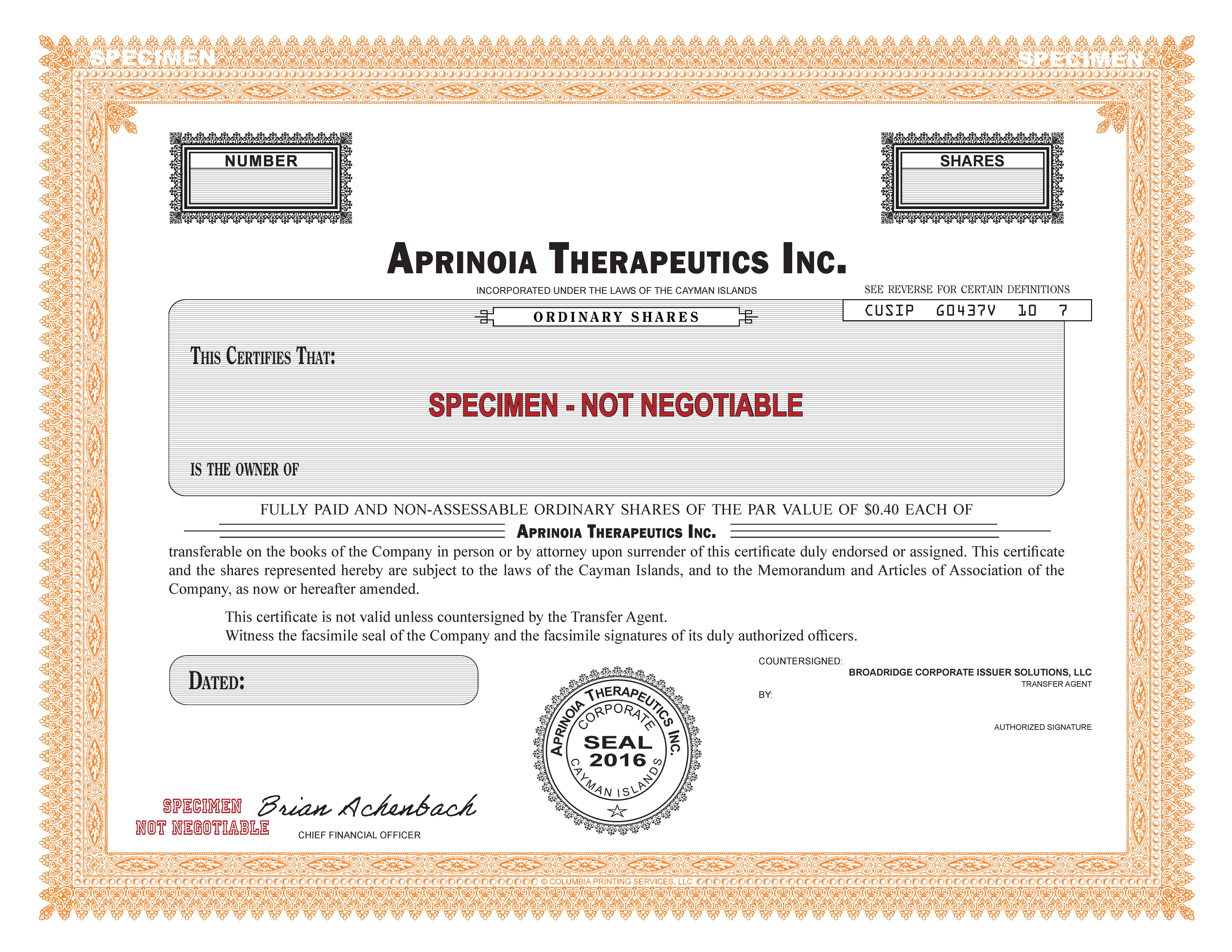 | | | Amendment Agreement of Exclusive License Agreement dated January 11, 2018 among National Institutes for Quantum and Radiological Science and Technology, APRINOIA Therapeutics Inc. (a corporation of Taiwan) and APRINOIA Therapeutics Inc. (a corporation of Cayman Islands) | |
