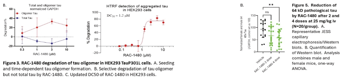 • | Protein degrader platform and PROTAC degraders. Our proprietary PROTAC degrader programs for α-Syn and tau are our most innovative and cutting-edge platforms and have the potential to herald an entirely new class of drugs for the treatment of neurodegenerative disorders such as AD and PD. Our tau and α-Syn degrader programs are currently in the preclinical stages. Empowered by our knowledge of aggregated protein binder chemistry from our PET tracer programs we have generated a proprietary degrader library of 800+ compounds in α-Syn and tau degrader space. α-Syn degraders are identified from a cellular model of human dopaminergic neurons and the active degraders have been validated in animal models for selectivity, mechanism of action, physicochemical and metabolic properties. Based on our preclinical data disclosed in “Business — Our Differentiated Therapeutic Platforms and Pipeline — Our Therapeutic Product Candidates — α-Syn Degrader — Preclinical Results” and “Business — Our Differentiated Therapeutic Platforms and Pipeline — Our Therapeutic Product Candidates — Tau Degrader — Preclinical Results”, we believe that it would be feasible for this class of molecules to achieve reasonable brain penetration. Importantly, in preliminary studies we have observed significant reduction of pathological α-Syn in transgenic mice. Our tau degrader program is supported by Alzheimer’s Drug Discovery Foundation (“ADDF”) following their scientific review of the program which included an independent review by external scientists from academia and industry, who are members of the foundation’s Scientific Review Board in addition to a review by members of the foundation’s Business Review Board. In the ADDF proposal, submitted to ADDF in December 2022, we described an experimental tau degrader RAC-1480, our lead compound at the time, which showed selective reduction of seed-induced tau aggregated formation in HEK293 cells and primary neurons. Intravenous injection of RAC-1480 at 25 mg/kg in rTg4510 tau transgenic mice reduced pathological tau species. The program has evolved rapidly since then and several new degraders have emerged with improved potency and ADME properties. TPD3 described in this document is one such improved tau degrader. The active compounds identified from our degrader library are highly selective for aggregated pathological tau while sparing the normal monomer tau. Similar to that with α-Syn degraders, we have conducted extensive work to validate the degrader mechanism and characterize metabolic and pharmacokinetic features. Both degrader programs are currently at lead optimization stages aiming for improved physicochemical properties, brain exposure and eventually robust in vivo efficacy by oral dosing. Our goal is to advance at least one degrader compound to IND-enabling GLP toxicology studies in 2025. |