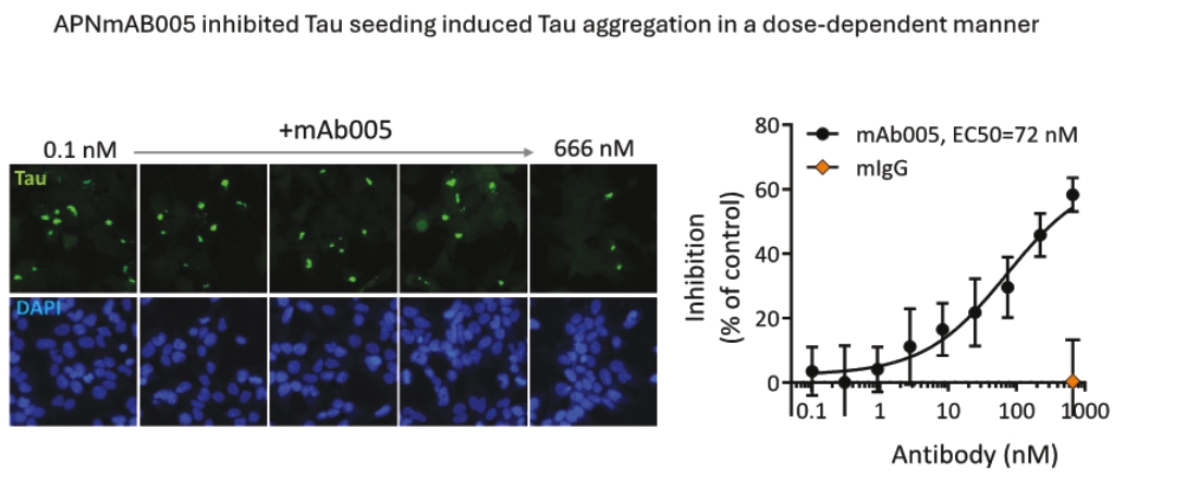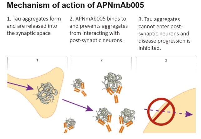 • | Our lead therapeutic product candidate (APNmAb005). APNmAb005 is a humanized anti-tau antibody and our most clinically advanced therapeutic product candidate. APNmAb005 is designed to preferentially bind pathological tau aggregates, not normal tau, that accumulate at the neuronal synapses with disease. In addition, based on preclinical studies we conducted, APNmAb005 recognizes a three-dimensional conformation-dependent epitope that is only present in tau abnormal aggregates but not in normal tau protein, thus suggesting this product candidate may achieve a high level of selectivity for pathological forms of tau. |