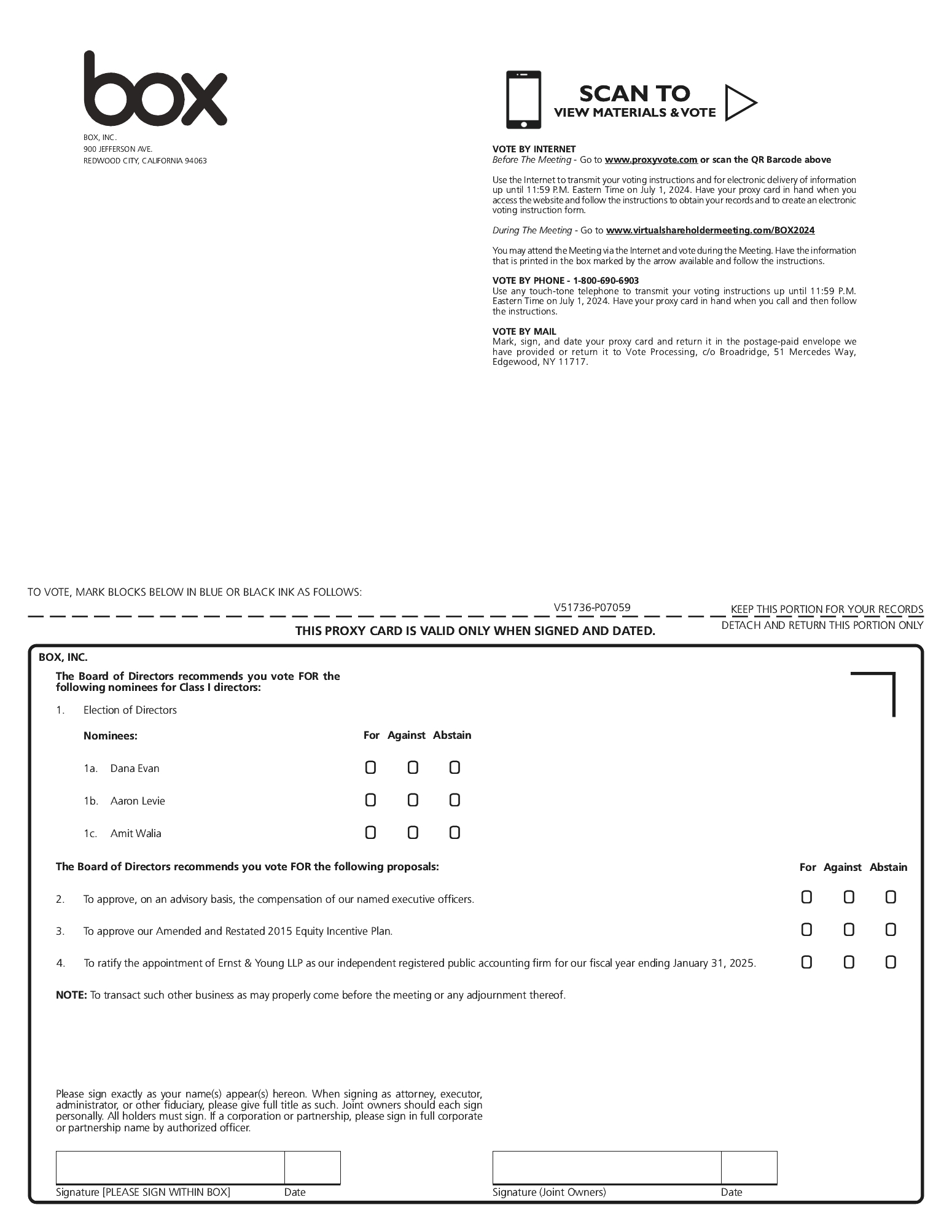 • | by attending the Annual Meeting by visiting http://www.virtualshareholdermeeting.com/BOX2024, where stockholders may vote and submit questions during the meeting (have your Notice or proxy card in hand when you visit the website). |