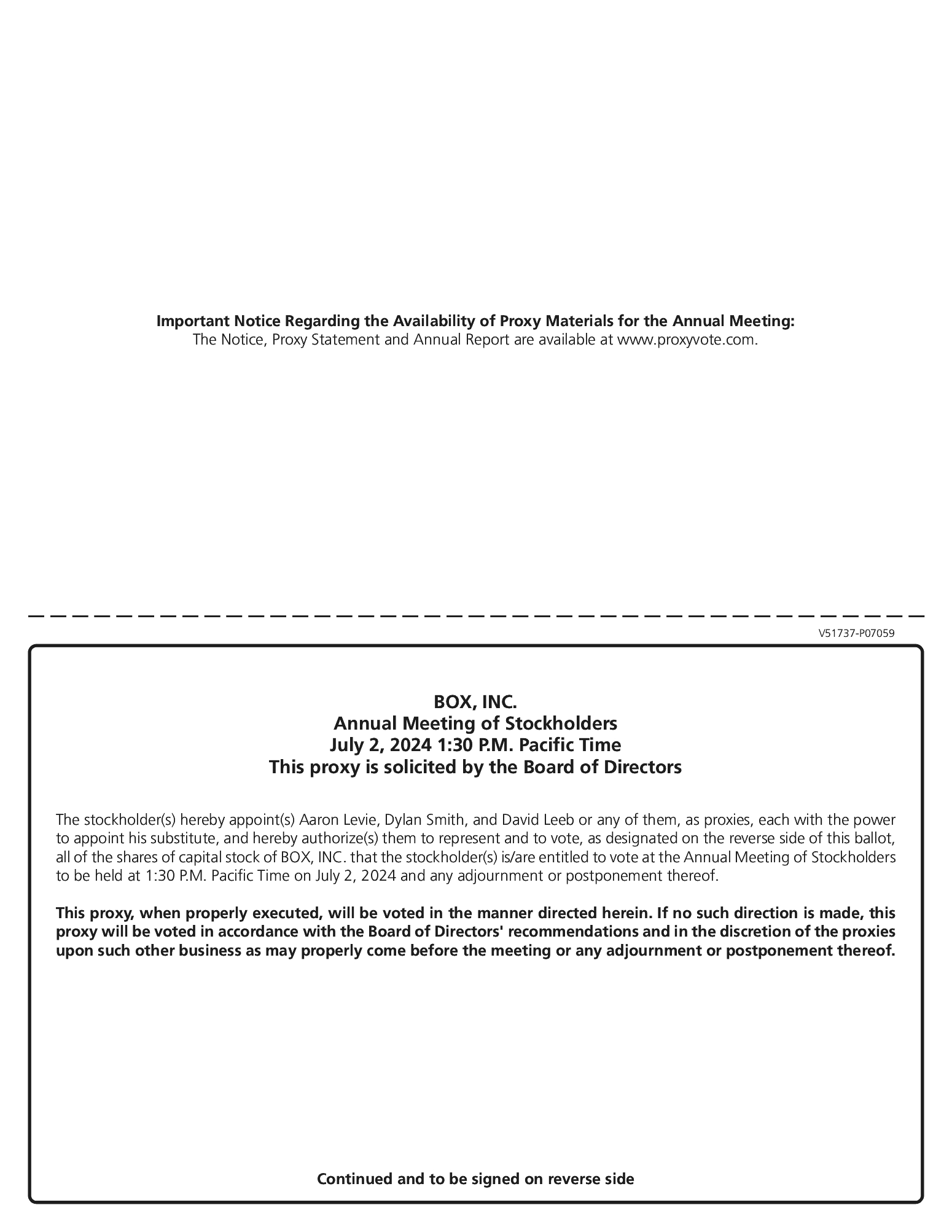 PLACE: | | | Similar to previous years, the 2024 annual meeting of stockholders of Box, Inc. (“Box” or the “company”) (including any postponements, adjournments or continuations thereof, the “Annual Meeting”) will be a completely virtual meeting of stockholders. You can attend the Annual Meeting by visiting http://www.virtualshareholdermeeting.com/BOX2024 where you will be able to listen to the meeting live, submit questions and vote online. |