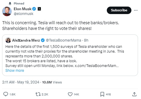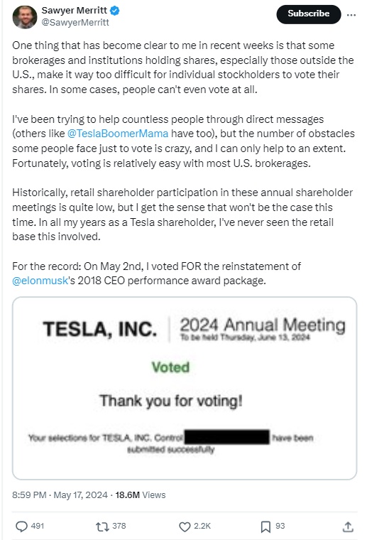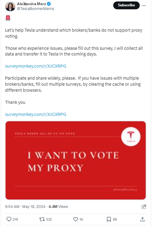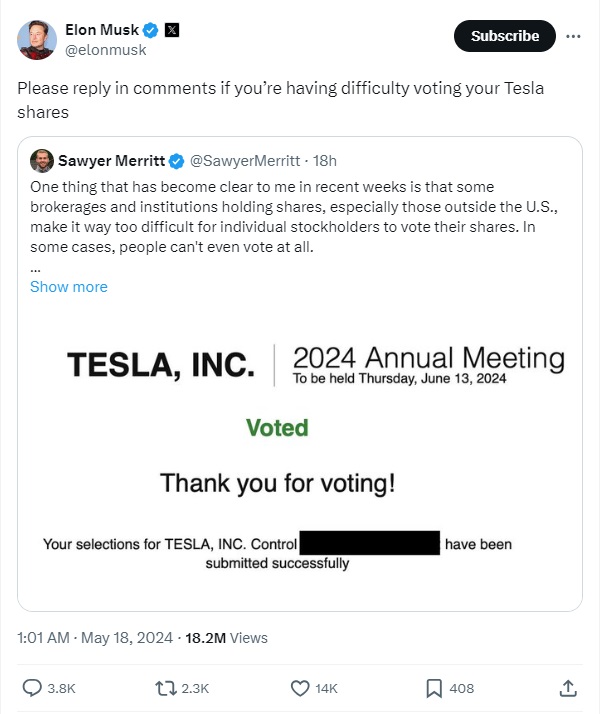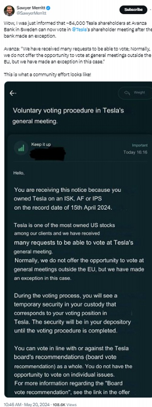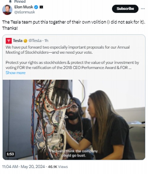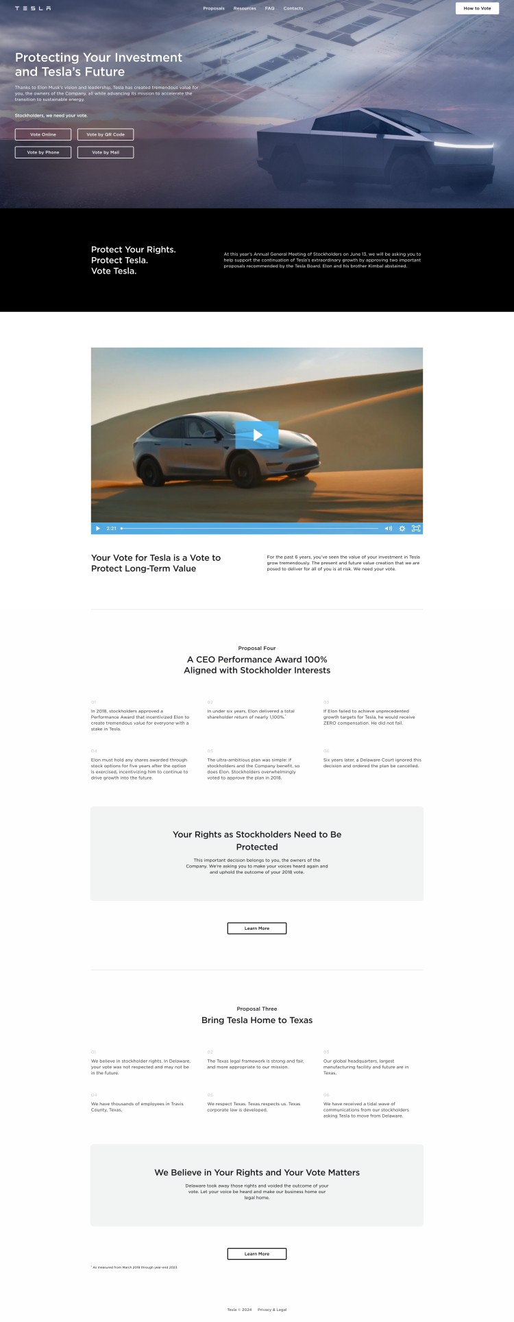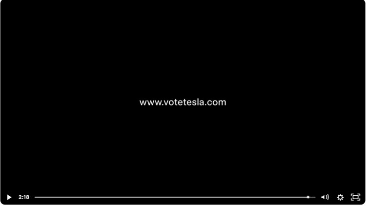 On May 20, 2024, Tesla, Inc. posted the following video (the "Video") to its website, www.VoteTesla.com, and on X.