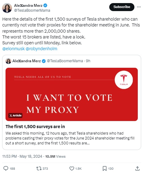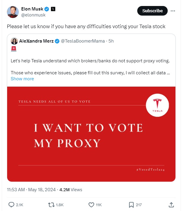 Tesla, Inc. (“Tesla”) has filed with the Securities and Exchange Commission (the “SEC”) a definitive proxy statement on Schedule 14A with respect to its solicitation of proxies for Tesla’s 2024 annual meeting (the “Definitive Proxy Statement”). The Definitive Proxy Statement contains important information about the matters to be voted on at the 2024 annual meeting. STOCKHOLDERS OF TESLA ARE URGED TO READ THESE MATERIALS (INCLUDING ANY AMENDMENTS OR SUPPLEMENTS THERETO) AND ANY OTHER RELEVANT DOCUMENTS THAT TESLA HAS FILED OR WILL FILE WITH THE SEC BECAUSE THEY CONTAIN OR WILL CONTAIN IMPORTANT INFORMATION ABOUT TESLA AND THE MATTERS TO BE VOTED ON AT THE 2024 ANNUAL MEETING. Stockholders are able to obtain free copies of these documents and other documents filed with the SEC by Tesla through the website maintained by the SEC at www.sec.gov. In addition, stockholders are able to obtain free copies of these documents from Tesla by contacting Tesla’s Investor Relations by e-mail at ir@tesla.com, or by going to Tesla’s Investor Relations page on its website at ir.tesla.com.