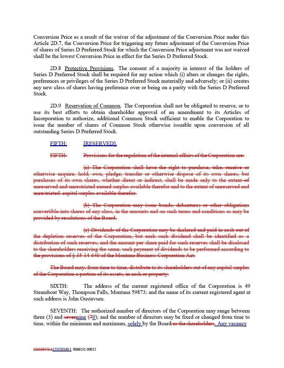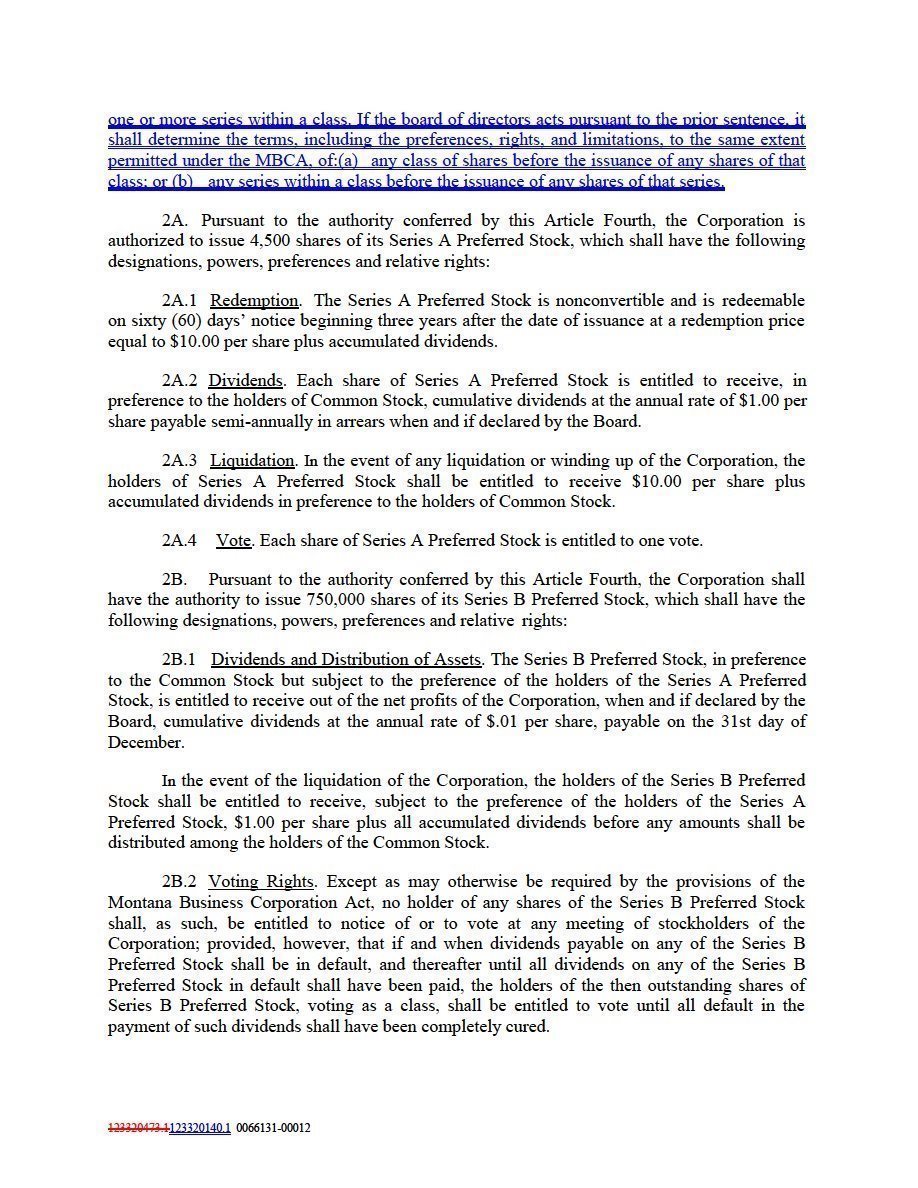 1 Will refer to Existing Articles if the Restated Articles are not approved by the Company’s shareholders and filed with the Montana Secretary of State