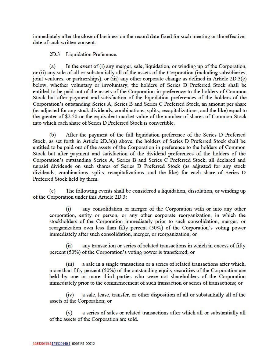 (a) In the event of (i) any merger, sale, liquidation, or winding up of the Corporation, or (ii) any sale of all or substantially all of the assets of the Corporation (including subsidiaries, joint ventures, or partnerships), or (iii) any other corporate change as defined in Article 2D.3(c) below, whether voluntary or involuntary, the holders of Series D Preferred Stock shall be entitled to be paid out of the assets of the Corporation in preference to the holders of Common Stock but after payment and satisfaction of the liquidation preferences of the holders of the Corporation’s outstanding Series A, Series B and Series C Preferred Stock, an amount per share (as adjusted for any stock dividends, combinations, splits, recapitalizations, and the like) equal to the greater of $2.50 or the equivalent market value of the number of shares of Common Stock into which each share of Series D Preferred Stock is convertible.
