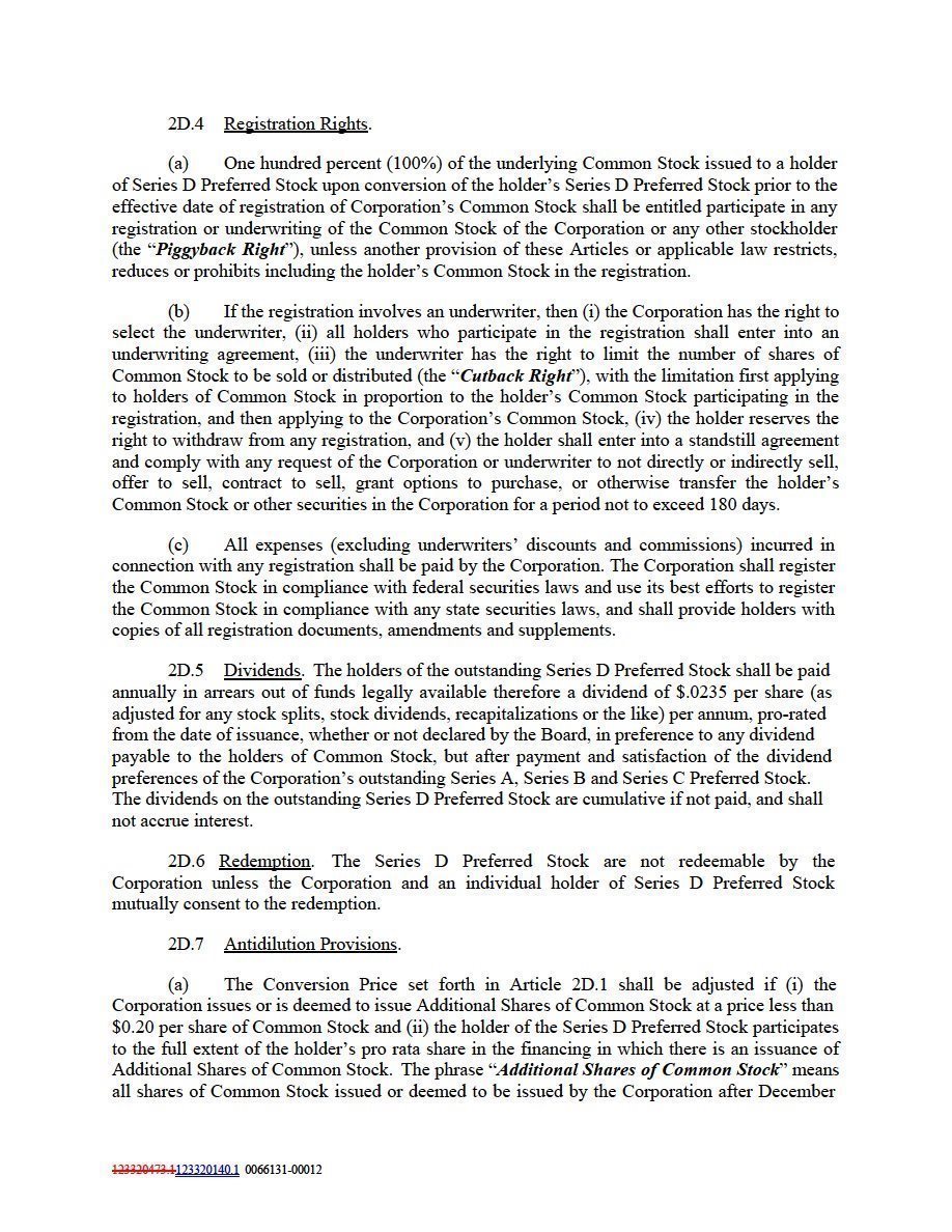 (a) The Conversion Price set forth in Article 2D.1 shall be adjusted if (i) the Corporation issues or is deemed to issue Additional Shares of Common Stock at a price less than $0.20 per share of Common Stock and (ii) the holder of the Series D Preferred Stock participates to the full extent of the holder’s pro rata share in the financing in which there is an issuance of Additional Shares of Common Stock. The phrase “Additional Shares of Common Stock” means all shares of Common Stock issued or deemed to be issued by the Corporation after December 31, 2002, including but not limited to (i) shares of Common Stock issuable, upon the exercise of rights, options or warrants to subscribe for, purchase or otherwise acquire shares of Common Stock, to subscribe for, purchase or otherwise acquire shares of Common Stock, (ii) shares of Common Stock issuable upon the conversion or exchange of the Corporation’s indebtedness, securities or otherwise, (iii) shares of Common Stock issued pursuant to a stock dividend, subdivision, reclassification or otherwise, (iv) shares of securities other than Common Stock issuable to holders of shares of Common Stock, and (v) shares of securities other than Common Stock issuable as a result of any reclassification, exchange or substitution of the shares of Common Stock. The phrase “Additional Shares of Common Stock” does not mean shares of Common Stock issued or deemed to be issued (i) to employees, consultants and directors pursuant to plans and arrangements approved by the Board before or after December 31, 2002; (ii) to lending or leasing institutions pursuant to agreements approved by the Board after December 31, 2002, and (iii) upon the exercise of warrants outstanding on December 31, 2002.