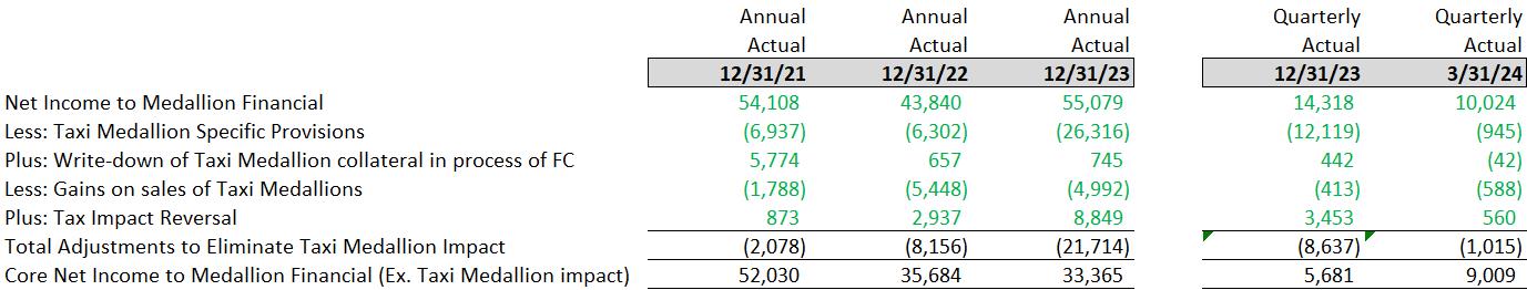 5 Source Company 10K/Qs. Taxi medallion adjustments consist of taking net income then subtracting Taxi Medallion specific provision reversals, adding repossessed Taxi Medallion collateral write-downs,