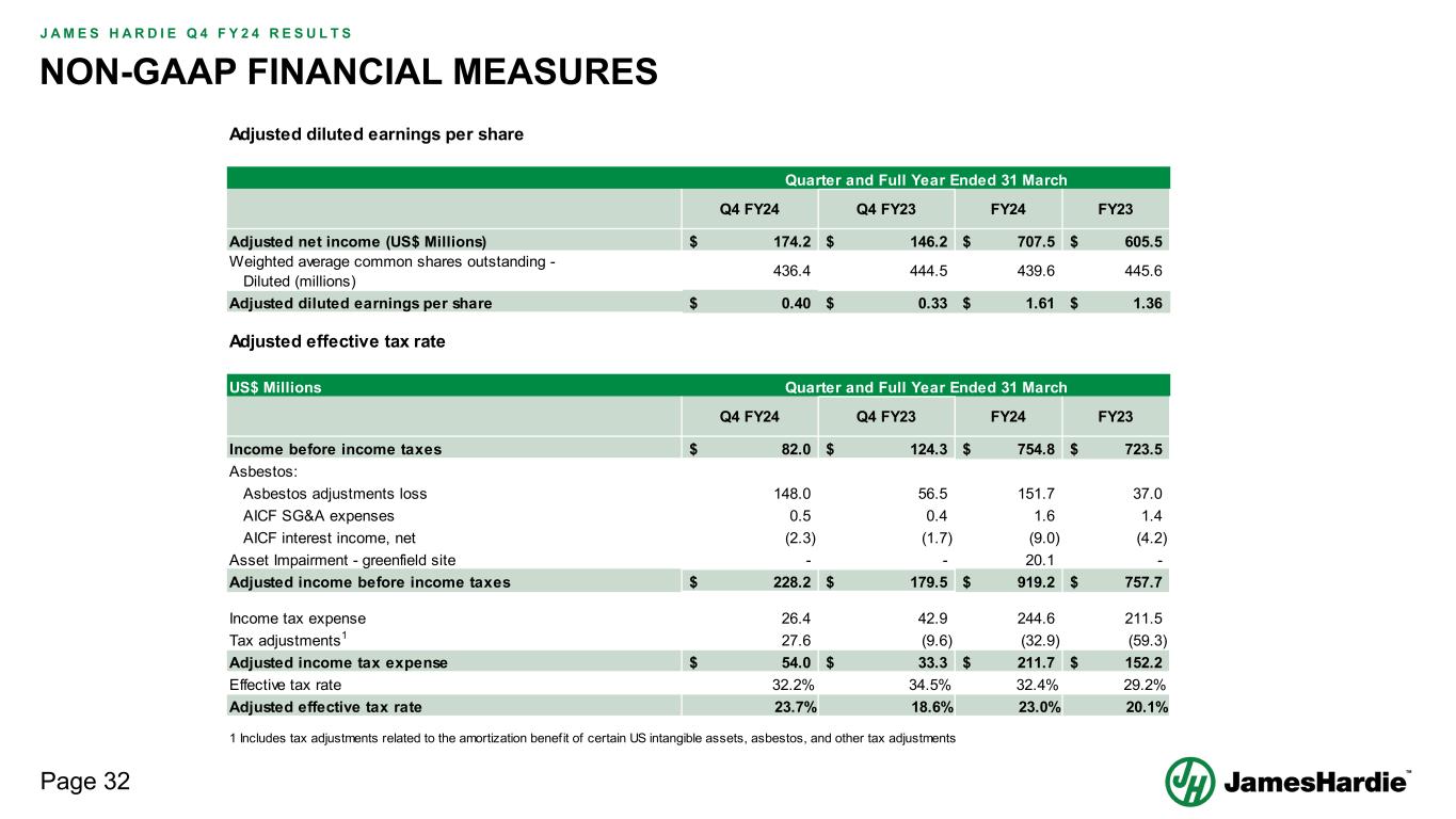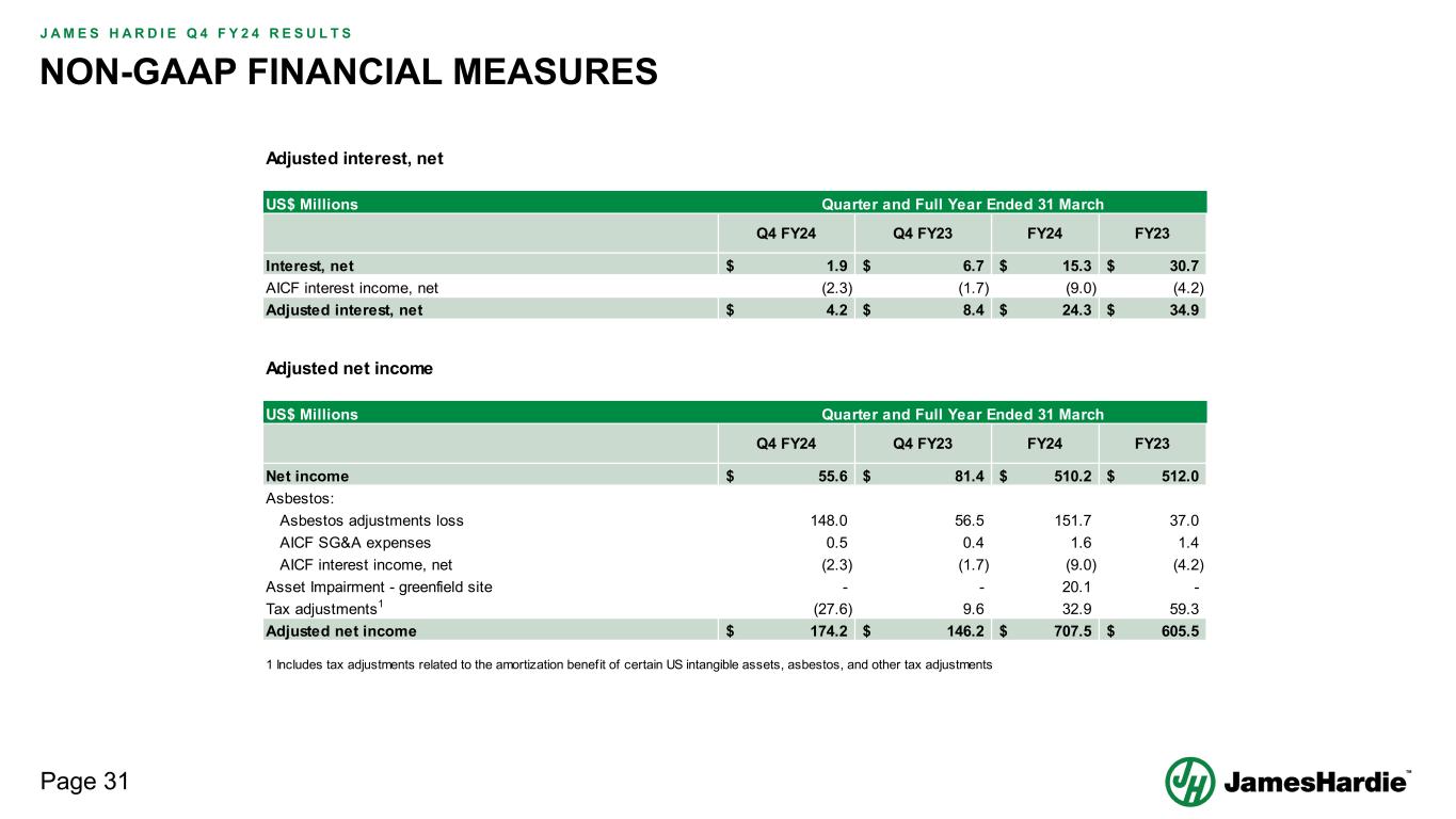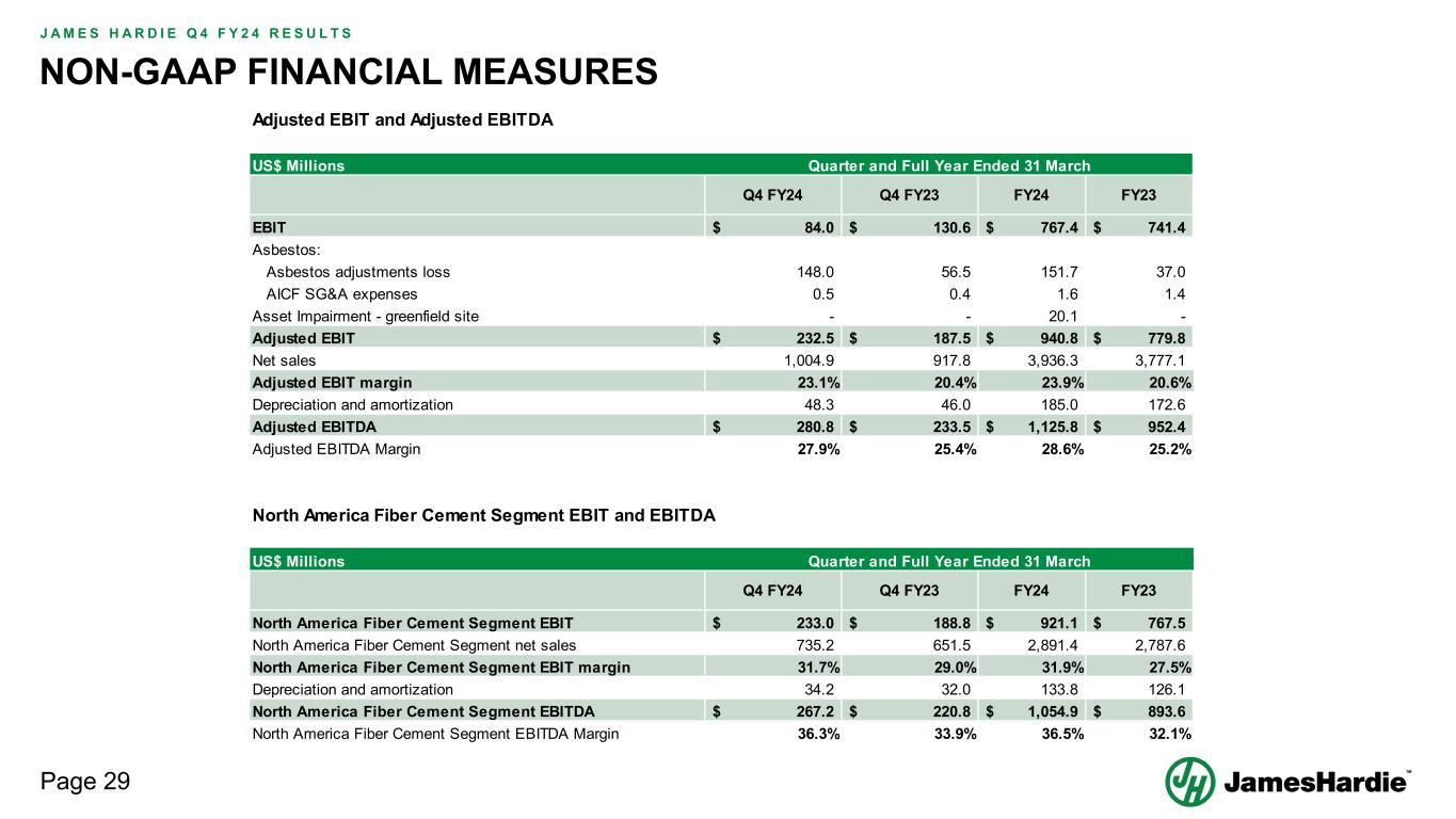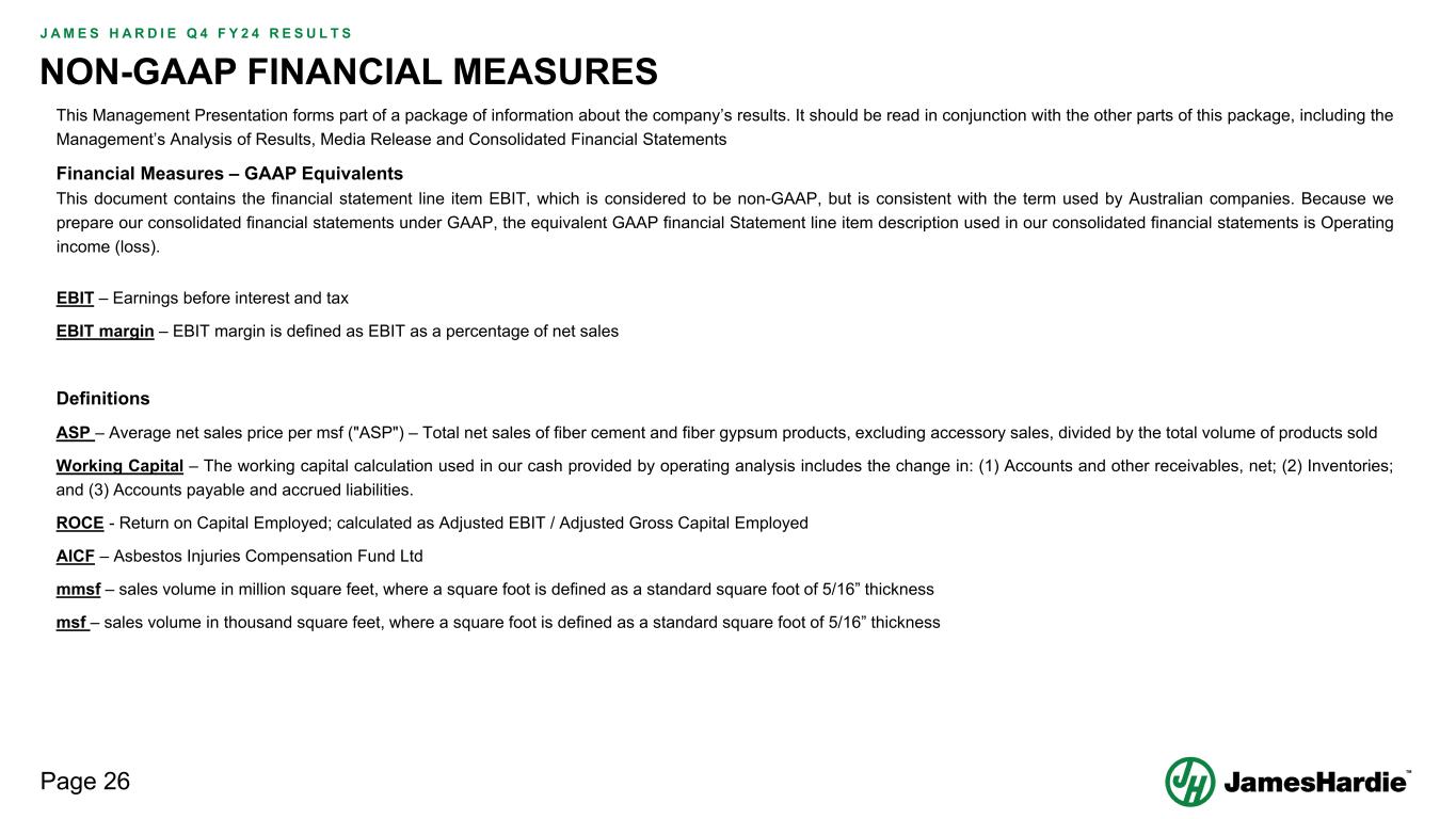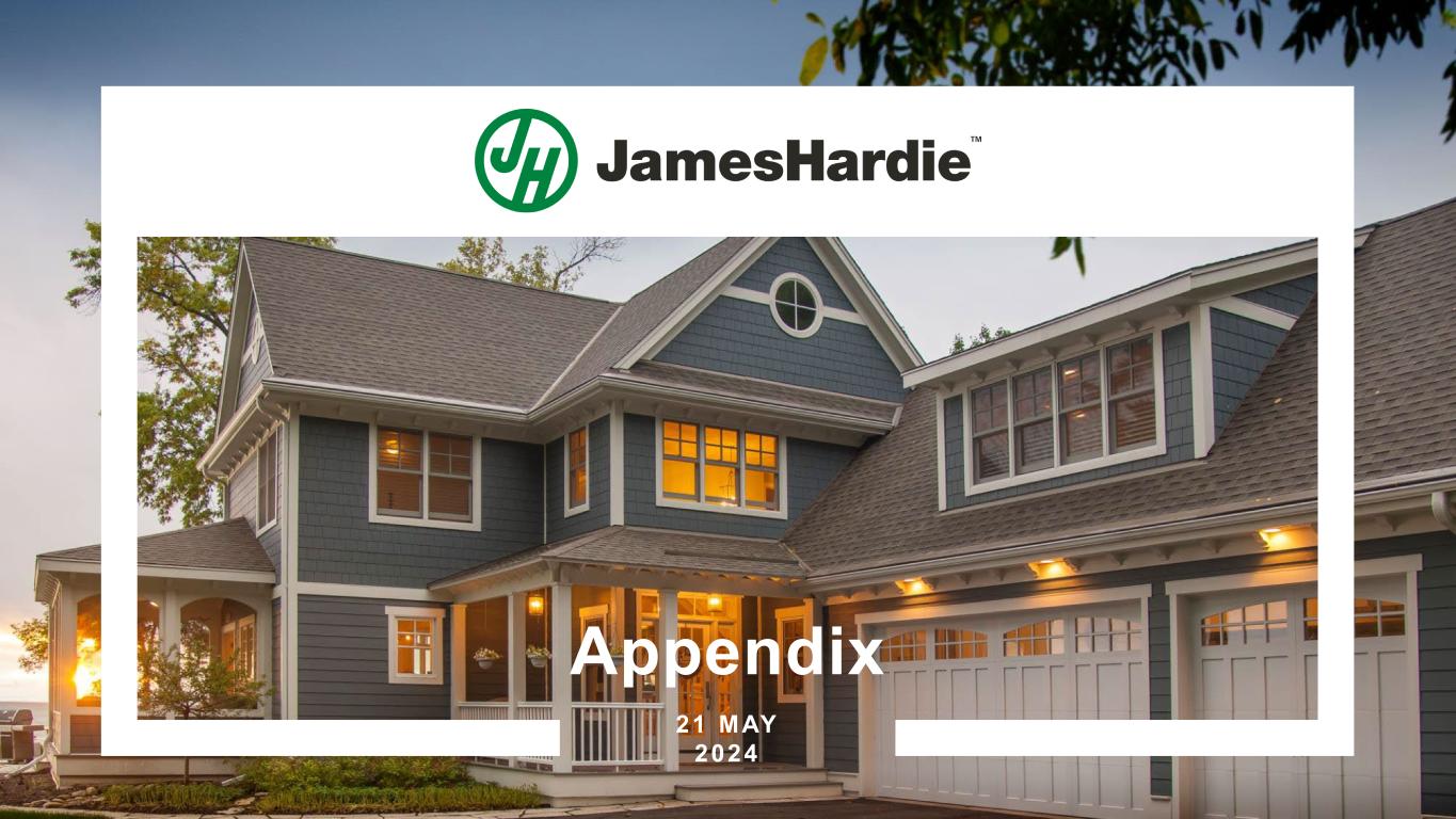 Forward-looking statements are based on the Company’s current expectations, estimates and assumptions and because forward-looking statements address future results, events and conditions, they, by their very nature, involve inherent risks and uncertainties, many of which are unforeseeable and beyond the Company’s control. Such known and unknown risks, uncertainties and other factors may cause actual results, performance or other achievements to differ materially from the anticipated results, performance or achievements expressed, projected or implied by these forward-looking statements. These factors, some of which are discussed under “Risk Factors” in Section 3 of the Form 20-F filed with the Securities and Exchange Commission on 20 May 2024, include, but are not limited to: all matters relating to or arising out of the prior manufacture of products that contained asbestos by current and former Company subsidiaries; required contributions to AICF, any shortfall in AICF funding and the effect of currency exchange rate movements on the amount recorded in the Company’s financial statements as an asbestos liability; compliance with and changes in tax laws and treatments; competition and product pricing in the markets in which the Company operates; the consequences of product failures or defects; exposure to environmental, asbestos, putative consumer class action or other legal proceedings; general economic and market conditions; the supply and cost of raw materials; possible increases in competition and the potential that competitors could copy the Company’s products; compliance with and changes in environmental and health and safety laws; risks of conducting business internationally; compliance with and changes in laws and regulations; currency exchange risks; dependence on customer preference and the concentration of the Company’s customer base; dependence on residential and commercial construction markets; the effect of adverse changes in climate or weather patterns; use of accounting estimates and financial condition and all other risks identified in the Company’s reports filed with Australian, Irish and US securities regulatory agencies and exchanges (as appropriate). The Company cautions you that the foregoing list of factors is not exhaustive and that other risks and uncertainties may cause actual results to differ materially from those referenced in the Company’s forward-looking statements. Forward-looking statements speak only as of the date they are made and are statements of the Company’s current expectations concerning future results, events and conditions. The Company assumes no obligation to update any forward-looking statements or information except as required by law.
