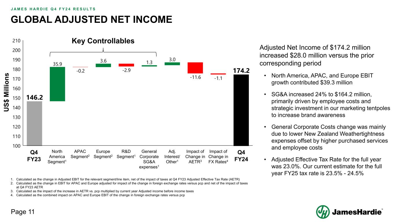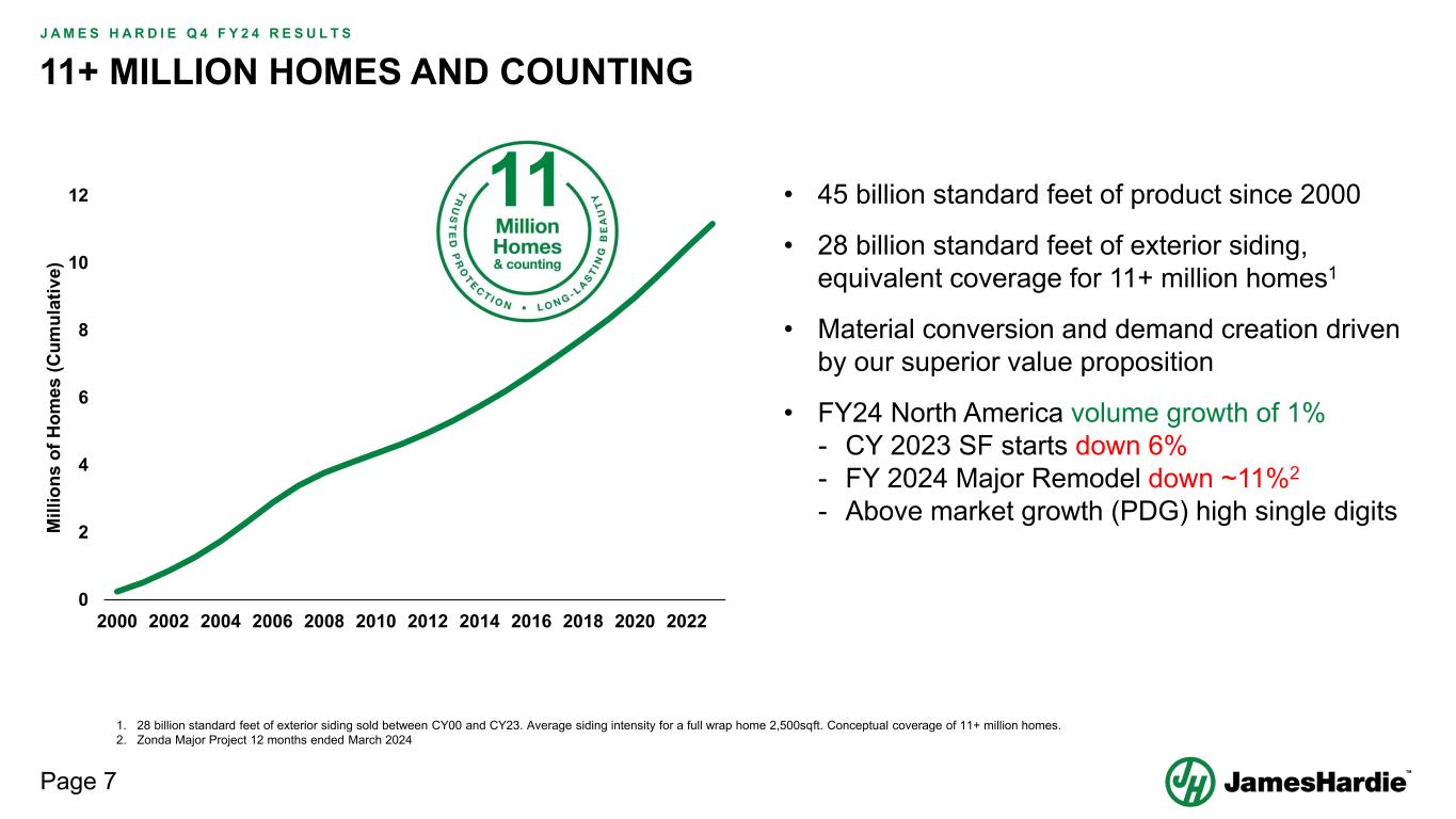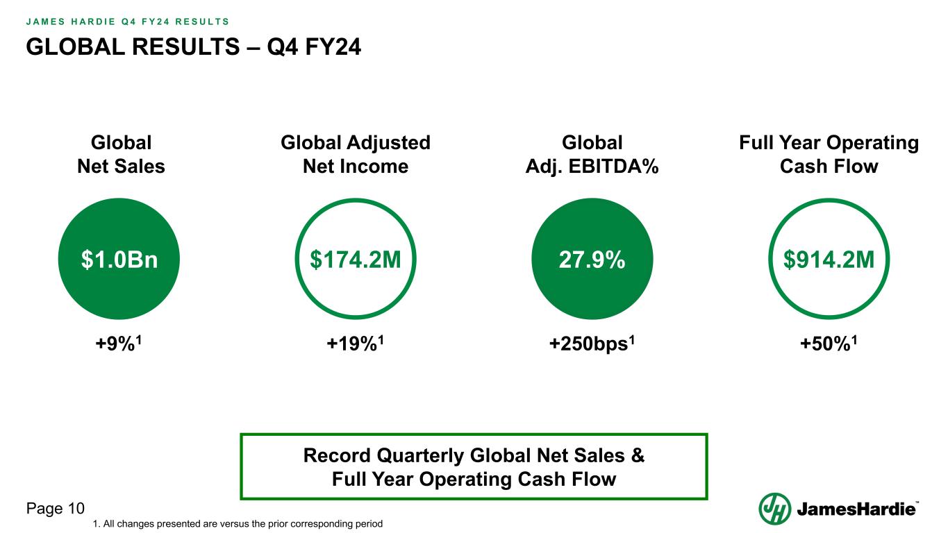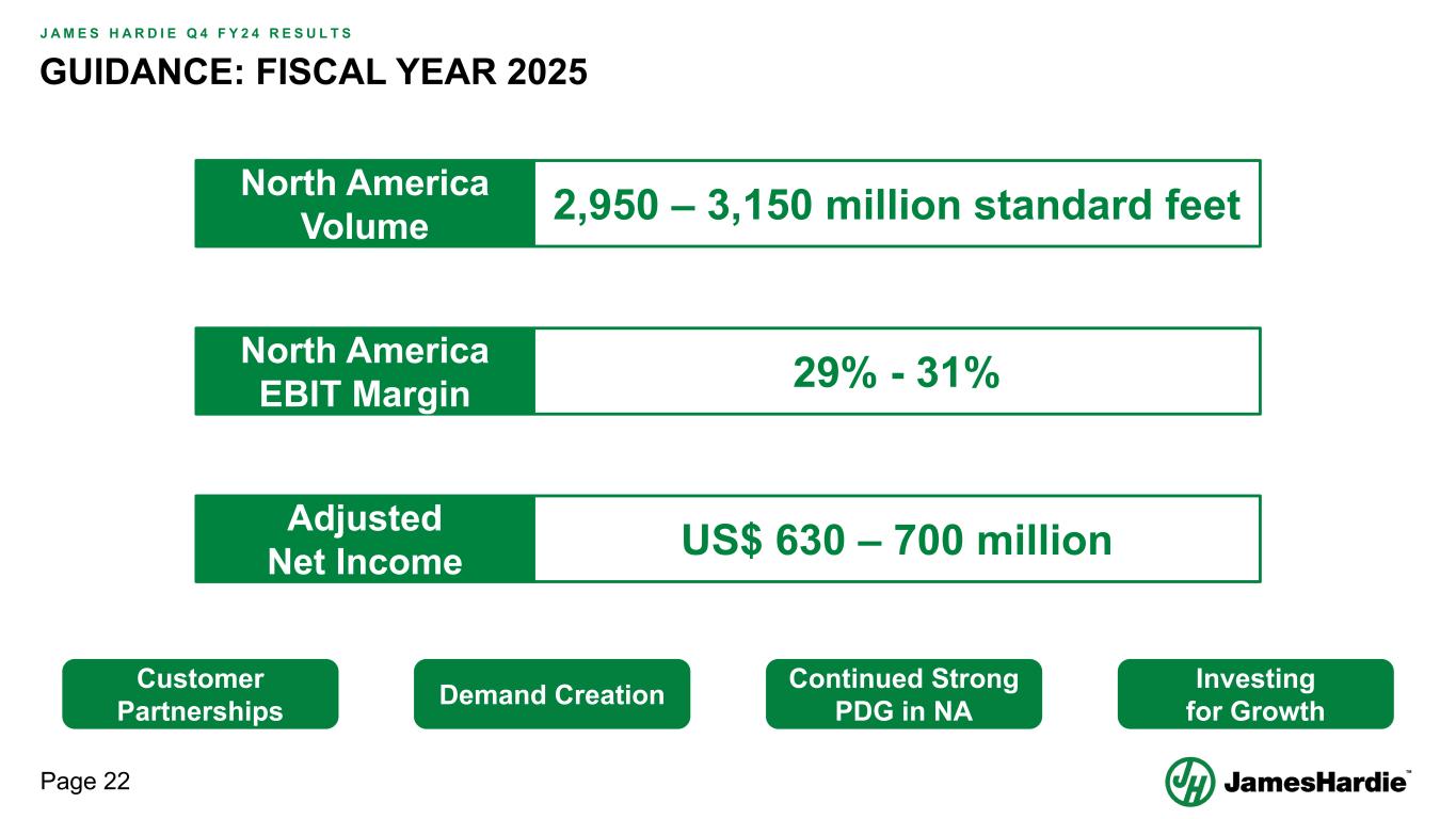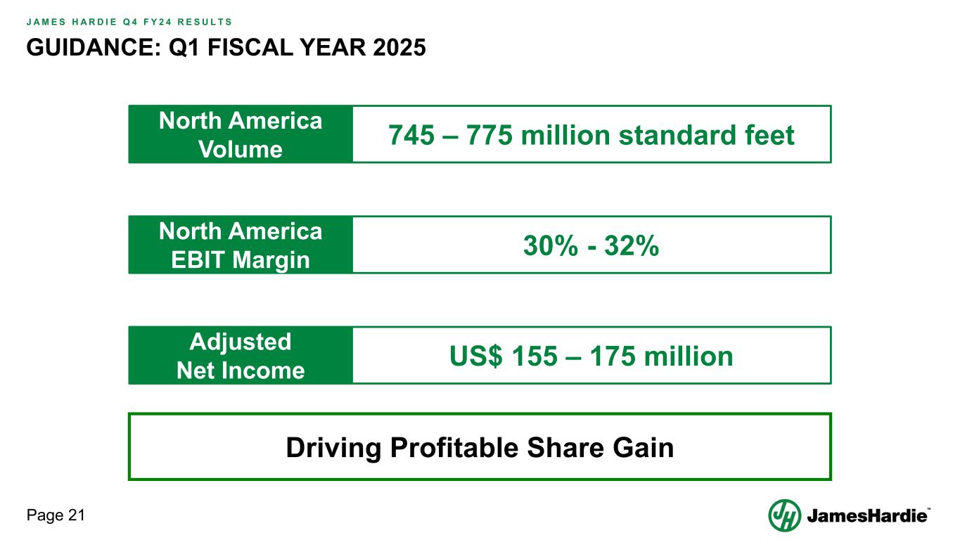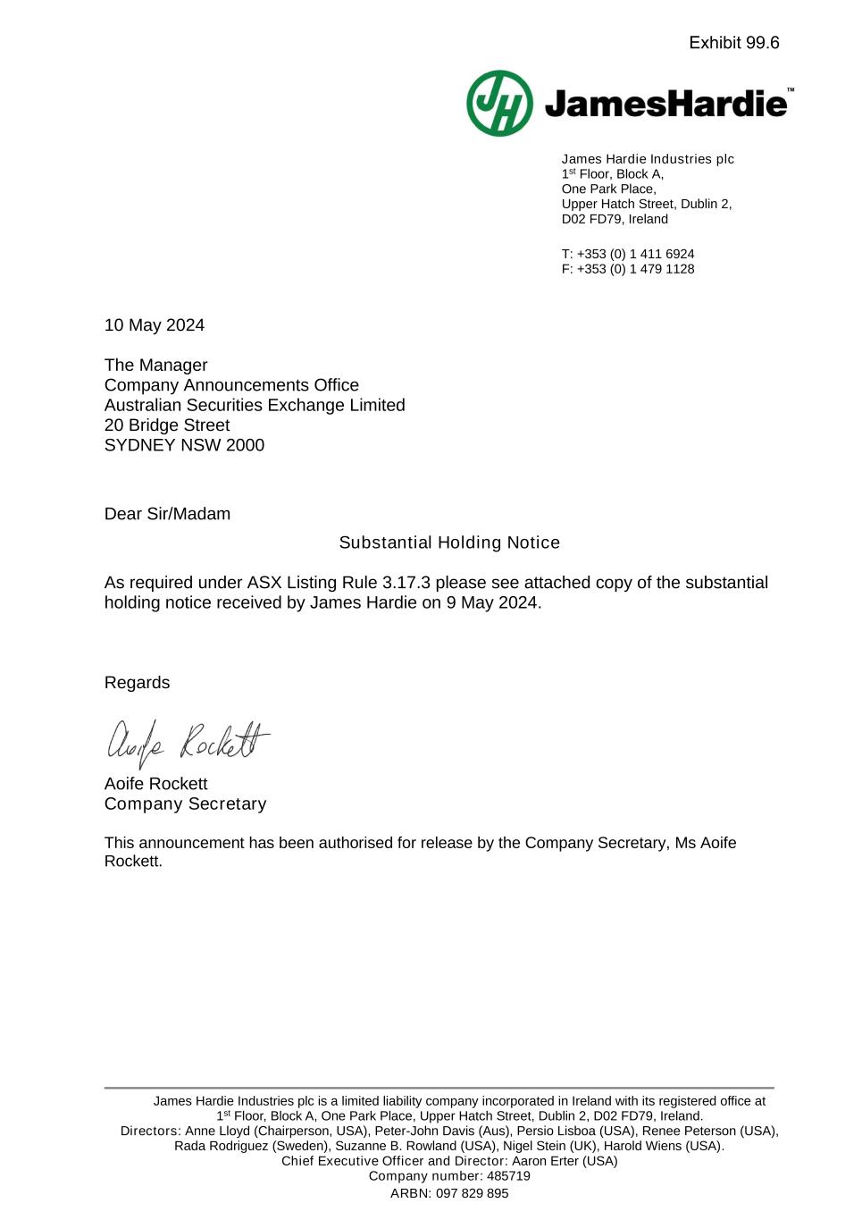 Forward-looking statements are based on the Company’s current expectations, estimates and assumptions and because forward-looking statements address future results, events and conditions, they, by their very nature, involve inherent risks and uncertainties, many of which are unforeseeable and beyond the Company’s control. Such known and unknown risks, uncertainties and other factors may cause actual results, performance or other achievements to differ materially from the anticipated results, performance or achievements expressed, projected or implied by these forward-looking statements. These factors, some of which are discussed under “Risk Factors” in Section 3 of the Form 20-F filed with the Securities and Exchange Commission on 20 May 2024, include, but are not limited to: all matters relating to or arising out of the prior manufacture of products that contained asbestos by current and former Company subsidiaries; required contributions to AICF, any shortfall in AICF funding and the effect of currency exchange rate movements on the amount recorded in the Company’s financial statements as an asbestos liability; compliance with and changes in tax laws and treatments; competition and product pricing in the markets in which the Company operates; the consequences of product failures or defects; exposure to environmental, asbestos, putative consumer class action or other legal proceedings; general economic and market conditions; the supply and cost of raw materials; possible increases in competition and the potential that competitors could copy the Company’s products; compliance with and changes in environmental and health and safety laws; risks of conducting business internationally; compliance with and changes in laws and regulations; currency exchange risks; dependence on customer preference and the concentration of the Company’s customer base; dependence on residential and commercial construction markets; the effect of adverse changes in climate or weather patterns; use of accounting estimates and financial condition and all other risks identified in the Company’s reports filed with Australian, Irish and US securities regulatory agencies and exchanges (as appropriate). The Company cautions you that the foregoing list of factors is not exhaustive and that other risks and uncertainties may cause actual results to differ materially from those referenced in the Company’s forward-looking statements. Forward-looking statements speak only as of the date they are made and are statements of the Company’s current expectations concerning future results, events and conditions. The Company assumes no obligation to update any forward-looking statements or information except as required by law.