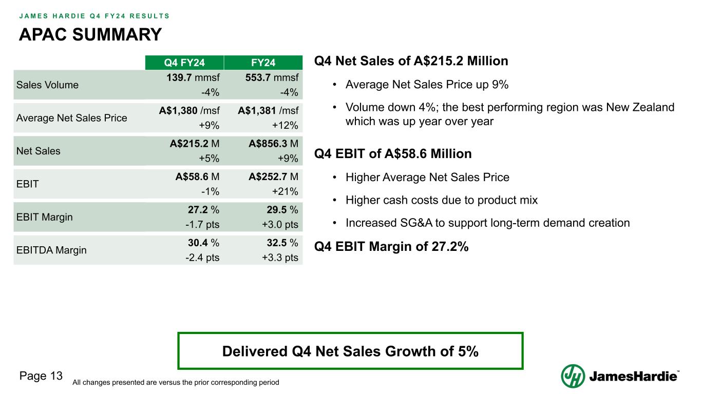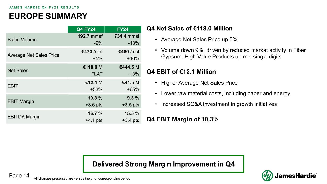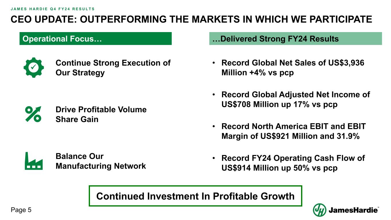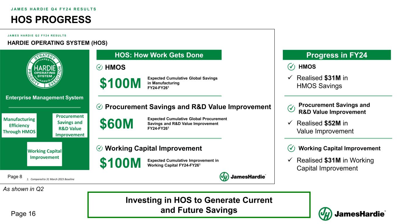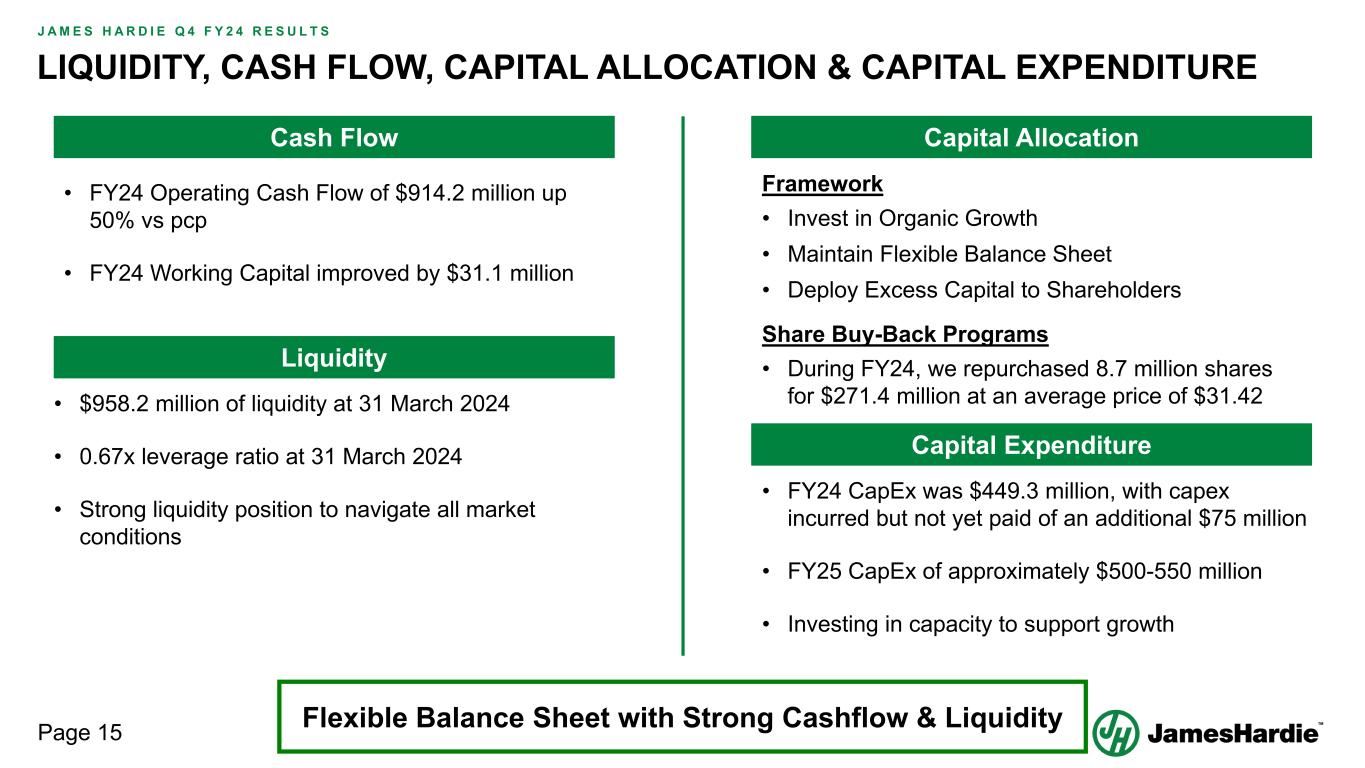 Forward-looking statements are based on the Company’s current expectations, estimates and assumptions and because forward-looking statements address future results, events and conditions, they, by their very nature, involve inherent risks and uncertainties, many of which are unforeseeable and beyond the Company’s control. Such known and unknown risks, uncertainties and other factors may cause actual results, performance or other achievements to differ materially from the anticipated results, performance or achievements expressed, projected or implied by these forward-looking statements. These factors, some of which are discussed under “Risk Factors” in Section 3 of the Form 20-F filed with the Securities and Exchange Commission on 20 May 2024, include, but are not limited to: all matters relating to or arising out of the prior manufacture of products that contained asbestos by current and former Company subsidiaries; required contributions to AICF, any shortfall in AICF funding and the effect of currency exchange rate movements on the amount recorded in the Company’s financial statements as an asbestos liability; compliance with and changes in tax laws and treatments; competition and product pricing in the markets in which the Company operates; the consequences of product failures or defects; exposure to environmental, asbestos, putative consumer class action or other legal proceedings; general economic and market conditions; the supply and cost of raw materials; possible increases in competition and the potential that competitors could copy the Company’s products; compliance with and changes in environmental and health and safety laws; risks of conducting business internationally; compliance with and changes in laws and regulations; currency exchange risks; dependence on customer preference and the concentration of the Company’s customer base; dependence on residential and commercial construction markets; the effect of adverse changes in climate or weather patterns; use of accounting estimates and financial condition and all other risks identified in the Company’s reports filed with Australian, Irish and US securities regulatory agencies and exchanges (as appropriate). The Company cautions you that the foregoing list of factors is not exhaustive and that other risks and uncertainties may cause actual results to differ materially from those referenced in the Company’s forward-looking statements. Forward-looking statements speak only as of the date they are made and are statements of the Company’s current expectations concerning future results, events and conditions. The Company assumes no obligation to update any forward-looking statements or information except as required by law.