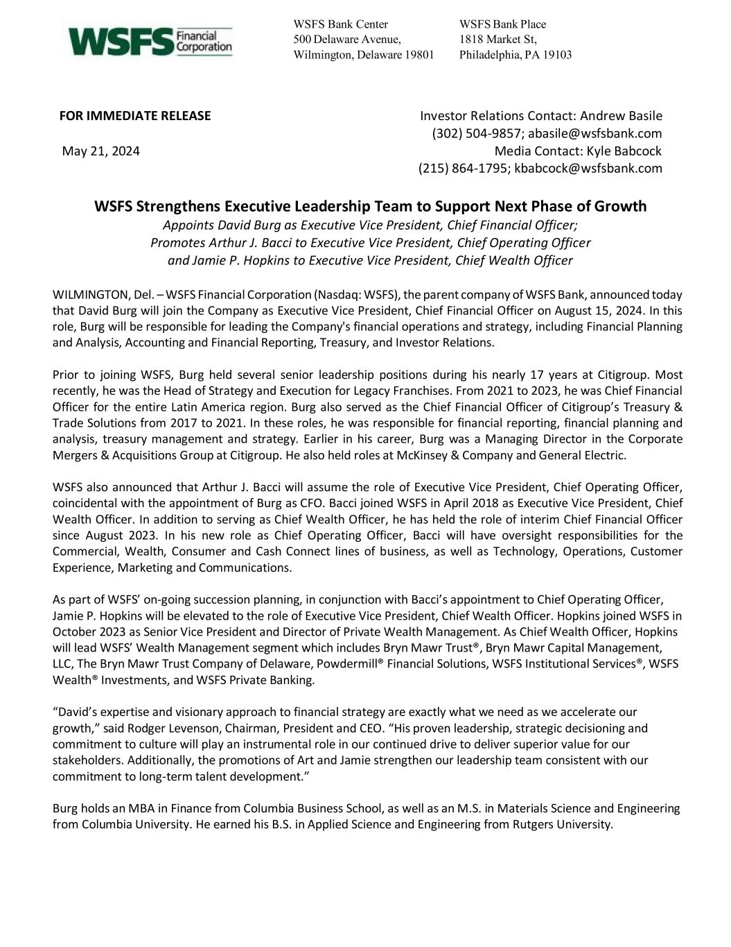 WSFS Bank Center 500 Delaware Avenue, Wilmington, Delaware 19801 WSFS Bank Place 1818 Market St, Philadelphia, PA 19103 FOR IMMEDIATE RELEASE Investor Relations Contact: Andrew Basile (302) 504-9857; abasile@wsfsbank.com May 21, 2024 Media Contact: Kyle Babcock (215) 864-1795; kbabcock@wsfsbank.com WSFS Strengthens Executive Leadership Team to Support Next Phase of Growth Appoints David Burg as Executive Vice President, Chief Financial Officer; Promotes Arthur J. Bacci to Executive Vice President, Chief Operating Officer and Jamie P. Hopkins to Executive Vice President, Chief Wealth Officer WILMINGTON, Del. – WSFS Financial Corporation (Nasdaq: WSFS), the parent company of WSFS Bank, announced today that David Burg will join the Company as Executive Vice President, Chief Financial Officer on August 15, 2024. In this role, Burg will be responsible for leading the Company's financial operations and strategy, including Financial Planning and Analysis, Accounting and Financial Reporting, Treasury, and Investor Relations. Prior to joining WSFS, Burg held several senior leadership positions during his nearly 17 years at Citigroup. Most recently, he was the Head of Strategy and Execution for Legacy Franchises. From 2021 to 2023, he was Chief Financial Officer for the entire Latin America region. Burg also served as the Chief Financial Officer of Citigroup’s Treasury & Trade Solutions from 2017 to 2021. In these roles, he was responsible for financial reporting, financial planning and analysis, treasury management and strategy. Earlier in his career, Burg was a Managing Director in the Corporate Mergers & Acquisitions Group at Citigroup. He also held roles at McKinsey & Company and General Electric. WSFS also announced that Arthur J. Bacci will assume the role of Executive Vice President, Chief Operating Officer, coincidental with the appointment of Burg as CFO. Bacci joined WSFS in April 2018 as Executive Vice President, Chief Wealth Officer. In addition to serving as Chief Wealth Officer, he has held the role of interim Chief Financial Officer since August 2023. In his new role as Chief Operating Officer, Bacci will have oversight responsibilities for the Commercial, Wealth, Consumer and Cash Connect lines of business, as well as Technology, Operations, Customer Experience, Marketing and Communications. As part of WSFS’ on-going succession planning, in conjunction with Bacci’s appointment to Chief Operating Officer, Jamie P. Hopkins will be elevated to the role of Executive Vice President, Chief Wealth Officer. Hopkins joined WSFS in October 2023 as Senior Vice President and Director of Private Wealth Management. As Chief Wealth Officer, Hopkins will lead WSFS’ Wealth Management segment which includes Bryn Mawr Trust®, Bryn Mawr Capital Management, LLC, The Bryn Mawr Trust Company of Delaware, Powdermill® Financial Solutions, WSFS Institutional Services®, WSFS Wealth® Investments, and WSFS Private Banking. “David’s expertise and visionary approach to financial strategy are exactly what we need as we accelerate our growth,” said Rodger Levenson, Chairman, President and CEO. “His proven leadership, strategic decisioning and commitment to culture will play an instrumental role in our continued drive to deliver superior value for our stakeholders. Additionally, the promotions of Art and Jamie strengthen our leadership team consistent with our commitment to long-term talent development.” Burg holds an MBA in Finance from Columbia Business School, as well as an M.S. in Materials Science and Engineering from Columbia University. He earned his B.S. in Applied Science and Engineering from Rutgers University.