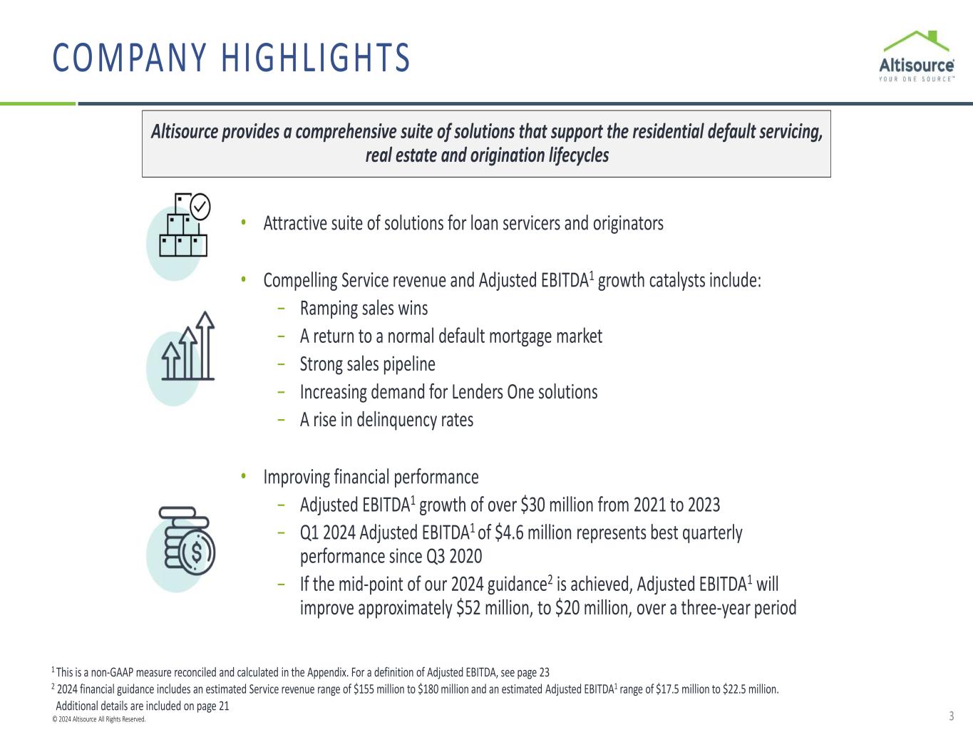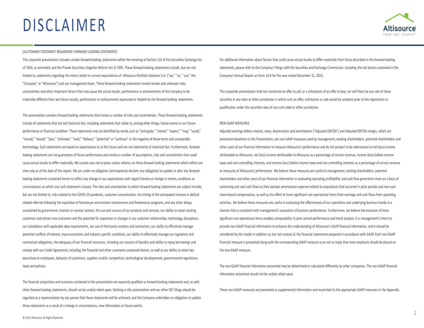 © 2024 Altisource All Rights Reserved. DISCLAIMER 2 CAUTIONARY STATEMENT REGARDING FORWARD LOOKING STATEMENTS This corporate presentation includes certain forward-looking statements within the meaning of Section 21E of the Securities Exchange Act of 1934, as amended, and the Private Securities Litigation Reform Act of 1995. These forward-looking statements include, but are not limited to, statements regarding the intent, belief or current expectations of Altisource Portfolio Solutions S.A. ("we," "us," "our," the "Company" or "Altisource") and our management team. These forward-looking statements involve known and unknown risks, uncertainties and other important factors that may cause the actual results, performance or achievements of the Company to be materially different from any future results, performance or achievements expressed or implied by the forward-looking statements. This presentation contains forward-looking statements that involve a number of risks and uncertainties. These forward-looking statements include all statements that are not historical fact, including statements that relate to, among other things, future events or our future performance or financial condition. These statements may be identified by words such as “anticipate,” “intend,” “expect,” “may,” “could,” “should,” “would,” “plan,” “estimate,” “seek,” “believe,” “potential” or “continue” or the negative of these terms and comparable terminology. Such statements are based on expectations as to the future and are not statements of historical fact. Furthermore, forward- looking statements are not guarantees of future performance and involve a number of assumptions, risks and uncertainties that could cause actual results to differ materially. We caution you not to place undue reliance on these forward-looking statements which reflect our view only as of the date of this report. We are under no obligation (and expressly disclaim any obligation) to update or alter any forward- looking statements contained herein to reflect any change in our expectations with regard thereto or change in events, conditions or circumstances on which any such statement is based. The risks and uncertainties to which forward-looking statements are subject include, but are not limited to, risks related to the COVID-19 pandemic, customer concentration, the timing of the anticipated increase in default related referrals following the expiration of foreclosure and eviction moratoriums and forbearance programs, and any other delays occasioned by government, investor or servicer actions, the use and success of our products and services, our ability to retain existing customers and attract new customers and the potential for expansion or changes in our customer relationships, technology disruptions, our compliance with applicable data requirements, our use of third party vendors and contractors, our ability to effectively manage potential conflicts of interest, macro-economic and industry specific conditions, our ability to effectively manage our regulatory and contractual obligations, the adequacy of our financial resources, including our sources of liquidity and ability to repay borrowings and comply with our Credit Agreement, including the financial and other covenants contained therein, as well as our ability to retain key executives or employees, behavior of customers, suppliers and/or competitors, technological developments, governmental regulations, taxes and policies. The financial projections and scenarios contained in this presentation are expressly qualified as forward-looking statements and, as with other forward-looking statements, should not be unduly relied upon. Nothing in this presentation and our other SEC filings should be regarded as a representation by any person that these statements will be achieved, and the Company undertakes no obligation to update these statements as a result of a change in circumstances, new information or future events. For additional information about factors that could cause actual results to differ materially from those described in the forward-looking statements, please refer to the Company’s filings with the Securities and Exchange Commission, including the risk factors contained in the Company’s Annual Report on Form 10-K for the year ended December 31, 2023. This corporate presentation shall not constitute an offer to sell, or a solicitation of an offer to buy, nor will there be any sale of these securities in any state or other jurisdiction in which such an offer, solicitation or sale would be unlawful prior to the registration or qualification under the securities laws of any such state or other jurisdiction. NON-GAAP MEASURES Adjusted earnings before interest, taxes, depreciation and amortization (“Adjusted EBITDA”) and Adjusted EBITDA margin, which are presented elsewhere in this Presentation, are non-GAAP measures used by management, existing shareholders, potential shareholders and other users of our financial information to measure Altisource’s performance and do not purport to be alternatives to net (loss) income attributable to Altisource, net (loss) income attributable to Altisource as a percentage of service revenue, income (loss) before income taxes and non-controlling interests, and income (loss) before income taxes and non-controlling interests as a percentage of service revenue as measures of Altisource’s performance. We believe these measures are useful to management, existing shareholders, potential shareholders and other users of our financial information in evaluating operating profitability and cash flow generation more on a basis of continuing cost and cash flows as they exclude amortization expense related to acquisitions that occurred in prior periods and non-cash share-based compensation, as well as the effect of more significant non-operational items from earnings and cash flows from operating activities