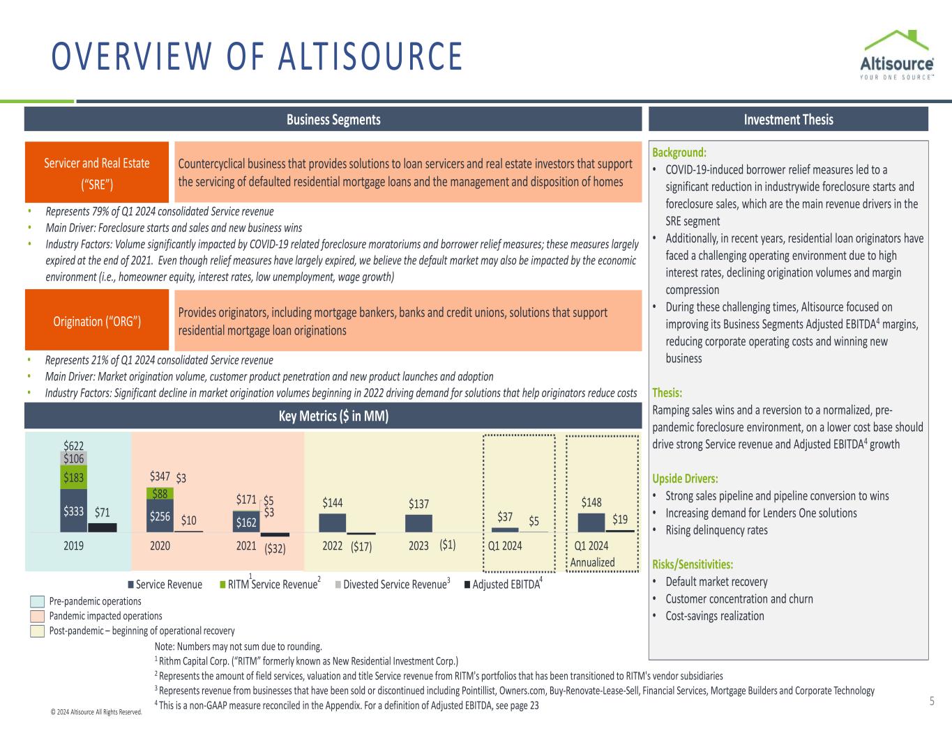 © 2024 Altisource All Rights Reserved. • Attractive suite of solutions for loan servicers and originators • Compelling Service revenue and Adjusted EBITDA1 growth catalysts include: − Ramping sales wins − A return to a normal default mortgage market − Strong sales pipeline − Increasing demand for Lenders One solutions − A rise in delinquency rates • Improving financial performance − Adjusted EBITDA1 growth of over $30 million from 2021 to 2023 − Q1 2024 Adjusted EBITDA1 of $4.6 million represents best quarterly performance since Q3 2020 − If the mid-point of our 2024 guidance2 is achieved, Adjusted EBITDA1 will improve approximately $52 million, to $20 million, over a three-year period COMPANY HIGHLIGHTS 3 1 This is a non-GAAP measure reconciled and calculated in the Appendix. For a definition of Adjusted EBITDA, see page 23 2 2024 financial guidance includes an estimated Service revenue range of $155 million to $180 million and an estimated Adjusted EBITDA1 range of $17.5 million to $22.5 million. Additional details are included on page 21 Altisource provides a comprehensive suite of solutions that support the residential default servicing, real estate and origination lifecycles