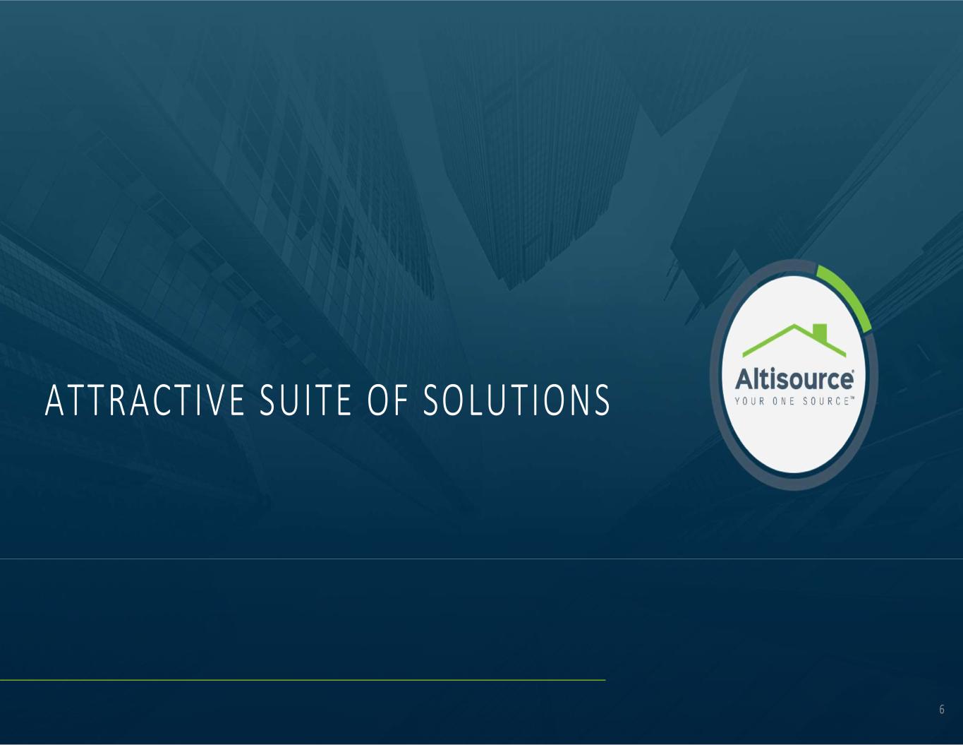 © 2024 Altisource All Rights Reserved. OVERVIEW OF ALTISOURCE 5 Note: Numbers may not sum due to rounding. 1 Rithm Capital Corp. (“RITM” formerly known as New Residential Investment Corp.) 2 Represents the amount of field services, valuation and title Service revenue from RITM's portfolios that has been transitioned to RITM's vendor subsidiaries 3 Represents revenue from businesses that have been sold or discontinued including Pointillist, Owners.com, Buy-Renovate-Lease-Sell, Financial Services, Mortgage Builders and Corporate Technology 4 This is a non-GAAP measure reconciled in the Appendix. For a definition of Adjusted EBITDA, see page 23 Pre-pandemic operations Pandemic impacted operations Post-pandemic – beginning of operational recovery 1 32 4 Servicer and Real Estate (“SRE”) Countercyclical business that provides solutions to loan servicers and real estate investors that support the servicing of defaulted residential mortgage loans and the management and disposition of homes Business Segments • Represents 79% of Q1 2024 consolidated Service revenue • Main Driver: Foreclosure starts and sales and new business wins • Industry Factors: Volume significantly impacted by COVID-19 related foreclosure moratoriums and borrower relief measures; these measures largely expired at the end of 2021. Even though relief measures have largely expired, we believe the default market may also be impacted by the economic environment (i.e., homeowner equity, interest rates, low unemployment, wage growth) Origination (“ORG”) Provides originators, including mortgage bankers, banks and credit unions, solutions that support residential mortgage loan originations • Represents 21% of Q1 2024 consolidated Service revenue • Main Driver: Market origination volume, customer product penetration and new product launches and adoption • Industry Factors: Significant decline in market origination volumes beginning in 2022 driving demand for solutions that help originators reduce costs Key Metrics ($ in MM) Investment Thesis Background: • COVID-19-induced borrower relief measures led to a significant reduction in industrywide foreclosure starts and foreclosure sales, which are the main revenue drivers in the SRE segment • Additionally, in recent years, residential loan originators have faced a challenging operating environment due to high interest rates, declining origination volumes and margin compression • During these challenging times, Altisource focused on improving its Business Segments Adjusted EBITDA4 margins, reducing corporate operating costs and winning new business Thesis: Ramping sales wins and a reversion to a normalized, pre- pandemic foreclosure environment, on a lower cost base should drive strong Service revenue and Adjusted EBITDA4 growth Upside Drivers: • Strong sales pipeline and pipeline conversion to wins • Increasing demand for Lenders One solutions • Rising delinquency rates Risks/Sensitivities: • Default market recovery • Customer concentration and churn • Cost-savings realization $333 $256 $162 $183 $88 $3 $106 $3 $5 $622 $347 $171 $144 $137 $37 $148 $71 $10 ($32) ($17) ($1) $5 $19 2019 2020 2021 2022 2023 Q1 2024 Q1 2024 Annualized Service Revenue RITM Service Revenue Divested Service Revenue Adjusted EBITDA