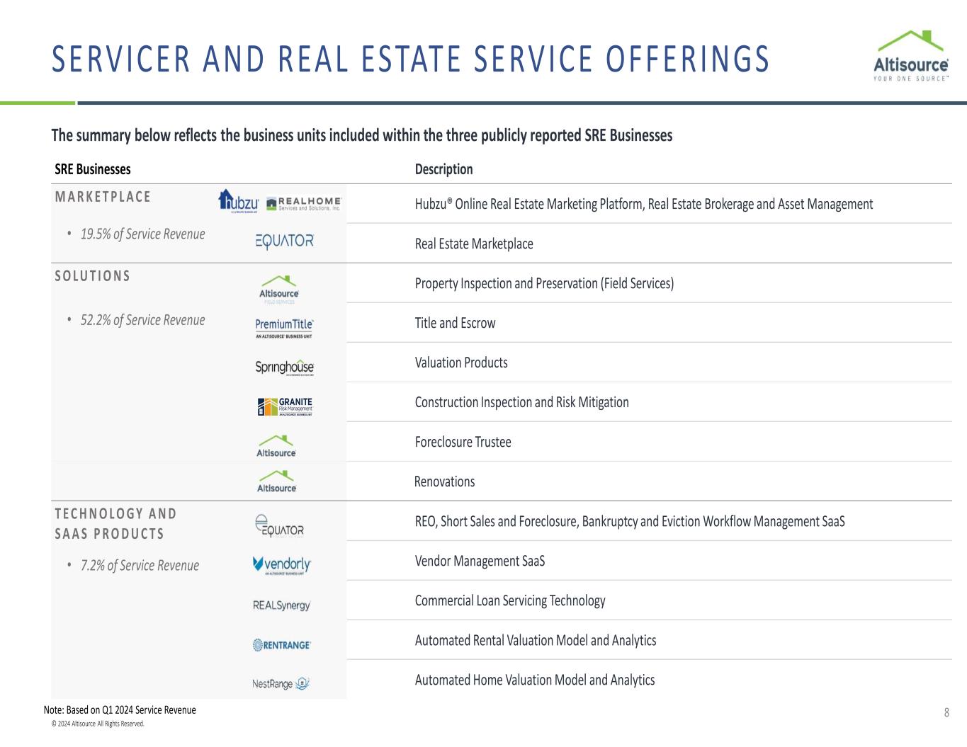 © 2024 Altisource All Rights Reserved. 7 Asset Management Workflow and Invoicing Solutions Technology solutions that support loan servicers and real estate investors Online Real Estate Marketing Platform Real Estate Marketplace Real Estate Brokerage Valuation Products Title and Escrow Construction Risk Management Property Inspection and Preservation (Field Services) Valuation Products Renovations Real Estate BrokerageReal Estate Marketplace Title and Escrow Automated Home Valuation Model and Analytics Construction Risk Management Automated Rental Valuation Model and Analytics Online Real Estate Marketing Platform Real Estate Brokerage Property Inspection and Preservation (Field Services) Title and Escrow Renovations Online Real Estate Marketing Platform Property Inspection and Preservation (Field Services) Foreclosure Trustee Property Inspection and Preservation (Field Services) Valuation Products Pre-foreclosure Title Pre-Foreclosure REO Management and DispositionPre-Foreclosure Foreclosure Real Estate DispositionReal Estate Due Diligence and Acquisition Real Estate Management .com .com Loan Servicers: Providing a suite of solutions that support the servicing of defaulted loans and management and disposition of homes Customers include six of the top 20 loan servicers1 and both GSEs Real Estate Investors: White space opportunity to deploy established solutions to the single-family rental and investor market 1 Source: Inside Mortgage Finance, Top 100 Firms in Owned Mortgage Servicing 4Q23 SOLUTIONS THAT SUPPORT LOAN SERVICERS AND REAL ESTATE INVESTORS