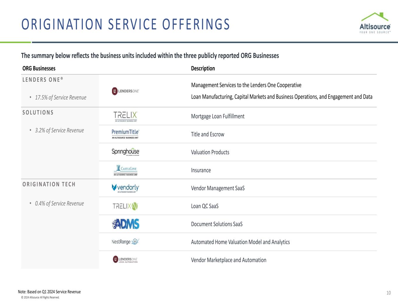 © 2024 Altisource All Rights Reserved. Membership Events Market Intelligence and Benchmarking Vendor Management SaaS Insurance Capital Markets Solutions Suite of Third-Party Solutions Borrower Verifications Tri-merge Credit and Related Products Flood Certifications Suite of Third-Party Solutions Homeowners and Auto Insurance2 Loan QC SaaS Document Solutions SaaS Mortgage Loan Fulfillment Automated Home Valuation Model and Analytics Valuation Products Title and Escrow 9 Engagement and DataLoan Manufacturing Capital Markets and Business Operations VERIFICATIONS CREDIT PREFERRED INVESTORS EVENTS DATA PREFERRED PROVIDERSPREFERRED PROVIDERS FLOOD Vendor Marketplace and Automation Platform Technology solutions that support components of the origination lifecycle Mortgage Originators: Providing a suite of solutions to help loan originators (primarily Lenders One members) better compete Customers include members of the Lenders One Cooperative that represents ~16% of U.S. residential originations1 1 Member market share based on 2023 HMDA data 2 Lenders One provides this service as an agent INSURANCE SOLUTIONS THAT SUPPORT LOAN ORIGINATORS