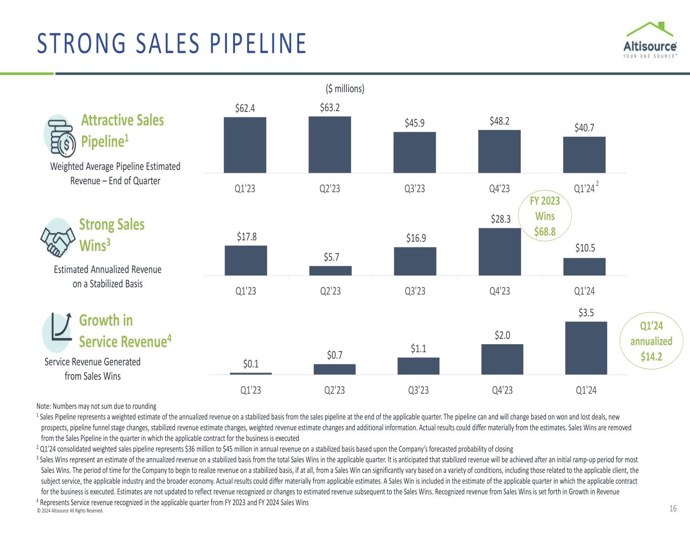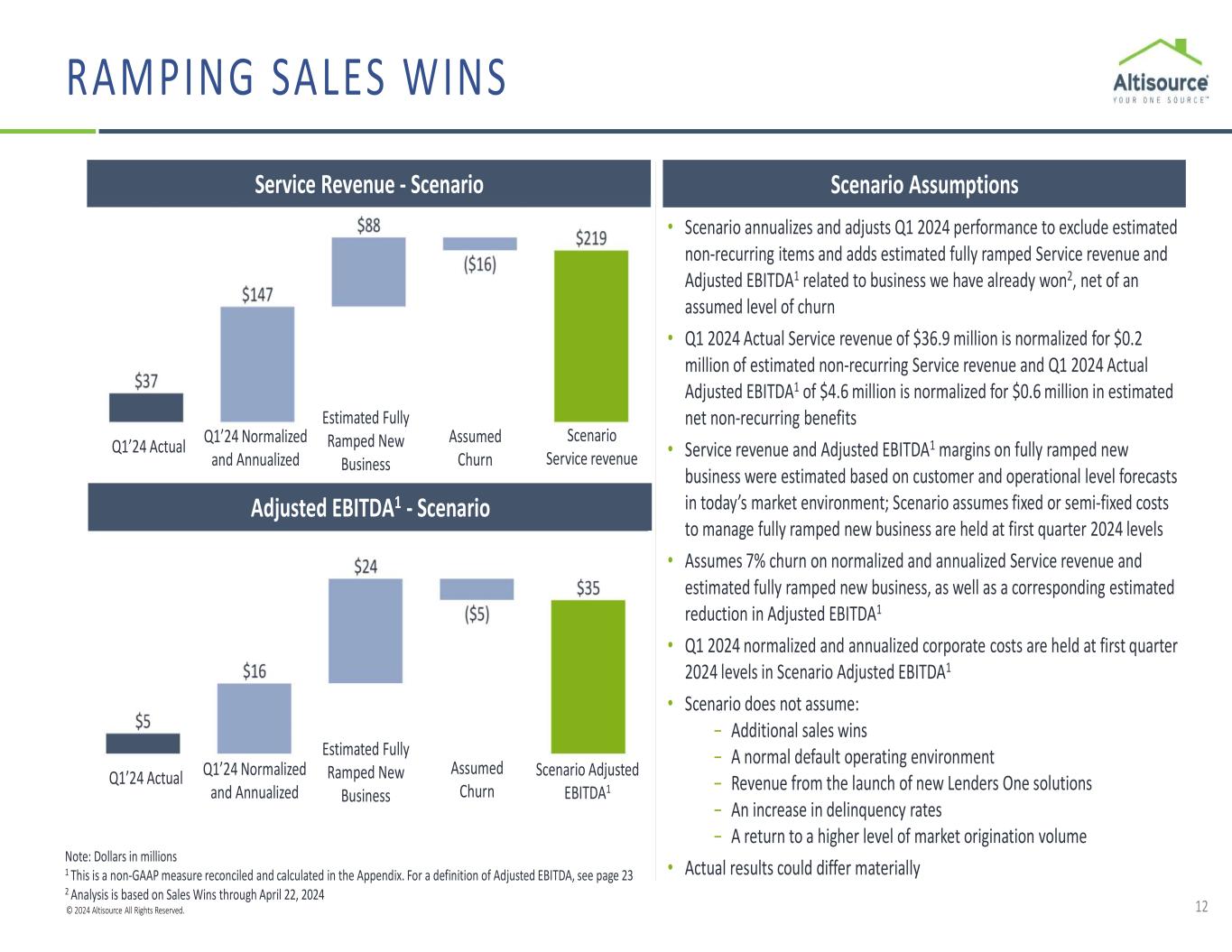 © 2024 Altisource All Rights Reserved. 12 Note: Dollars in millions 1 This is a non-GAAP measure reconciled and calculated in the Appendix. For a definition of Adjusted EBITDA, see page 23 2 Analysis is based on Sales Wins through April 22, 2024 • Scenario annualizes and adjusts Q1 2024 performance to exclude estimated non-recurring items and adds estimated fully ramped Service revenue and Adjusted EBITDA1 related to business we have already won2, net of an assumed level of churn • Q1 2024 Actual Service revenue of $36.9 million is normalized for $0.2 million of estimated non-recurring Service revenue and Q1 2024 Actual Adjusted EBITDA1 of $4.6 million is normalized for $0.6 million in estimated net non-recurring benefits • Service revenue and Adjusted EBITDA1 margins on fully ramped new business were estimated based on customer and operational level forecasts in today’s market environment; Scenario assumes fixed or semi-fixed costs to manage fully ramped new business are held at first quarter 2024 levels • Assumes 7% churn on normalized and annualized Service revenue and estimated fully ramped new business, as well as a corresponding estimated reduction in Adjusted EBITDA1 • Q1 2024 normalized and annualized corporate costs are held at first quarter 2024 levels in Scenario Adjusted EBITDA1 • Scenario does not assume: − Additional sales wins − A normal default operating environment − Revenue from the launch of new Lenders One solutions − An increase in delinquency rates − A return to a higher level of market origination volume • Actual results could differ materially Service Revenue - Scenario Scenario Assumptions Adjusted EBITDA1 - Scenario Q1’24 Actual Q1’24 Normalized and Annualized Estimated Fully Ramped New Business Assumed Churn Scenario Service revenue Q1’24 Actual Q1’24 Normalized and Annualized Estimated Fully Ramped New Business Assumed Churn Scenario Adjusted EBITDA1 RAMPING SALES WINS